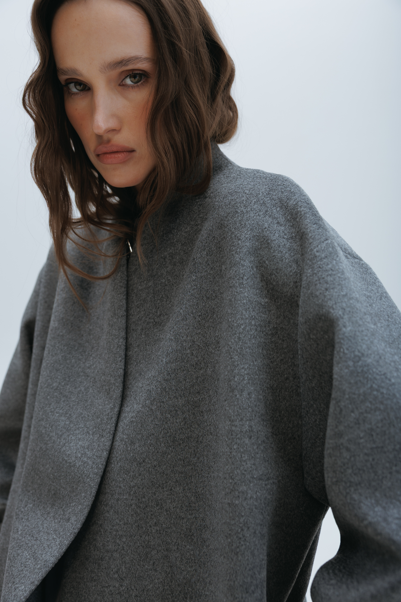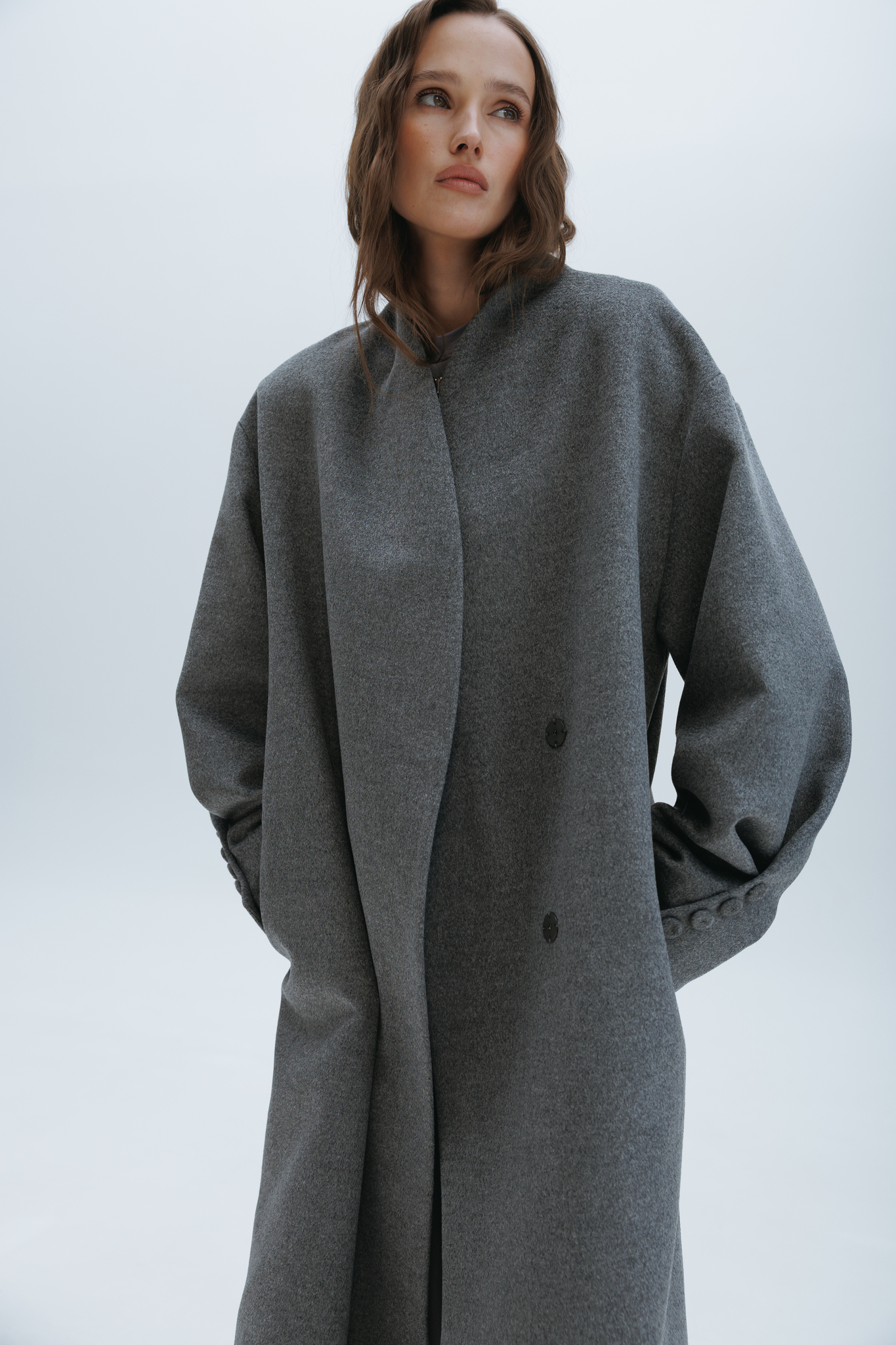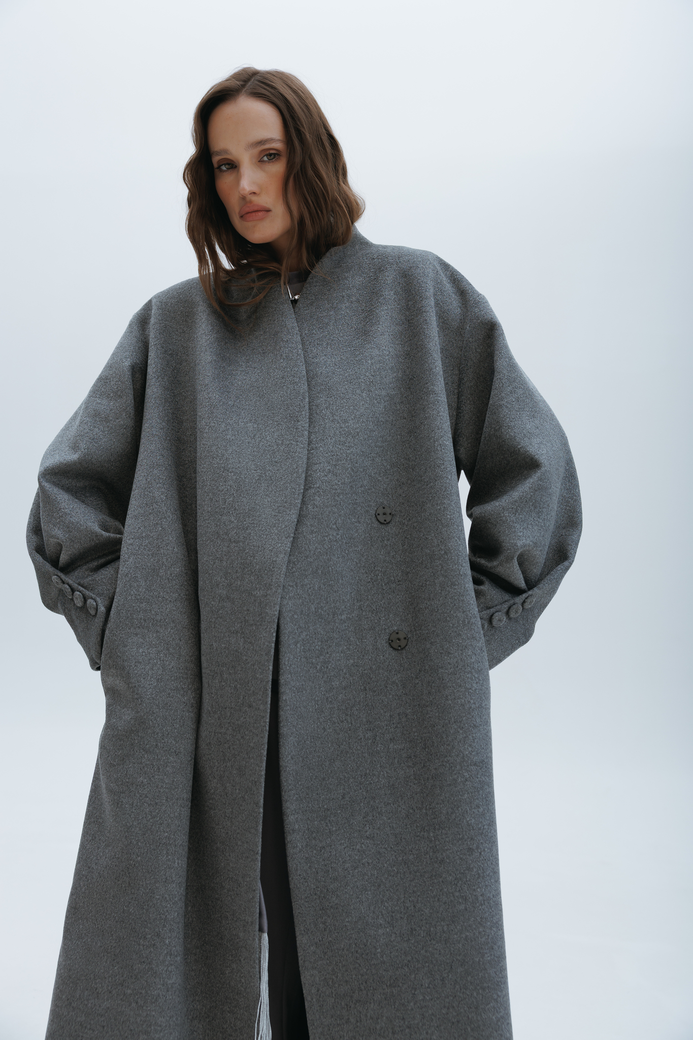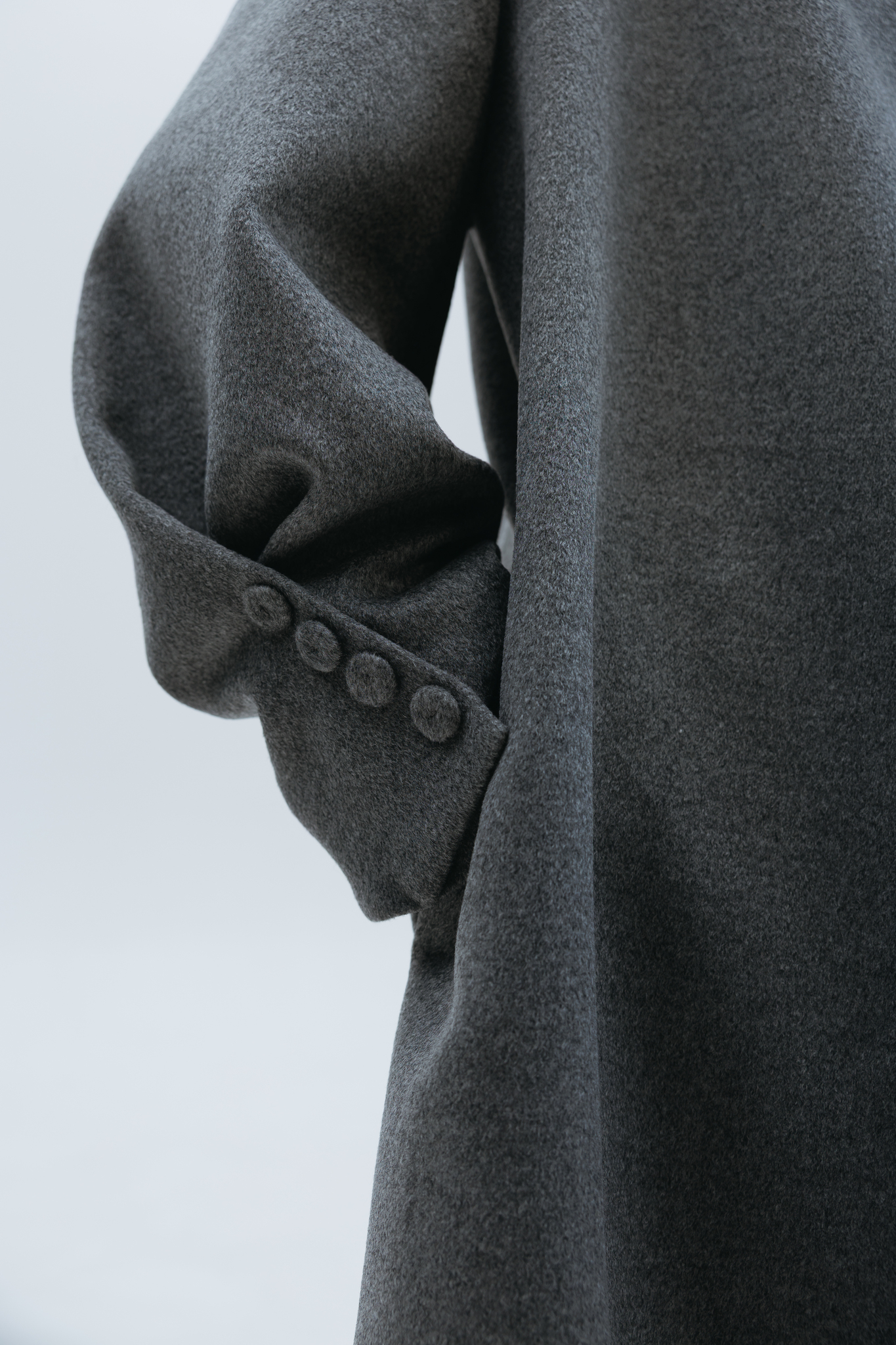 An Italian cashmere coat in a long, minimalist silhouette. Its fluid, flowing lines drape effortlessly, offering both comfort and absolute freedom of movement. The luxurious texture of the fabric is highlighted with every fold, creating an ethereal sense of lightness, elegance, and refined sophistication.