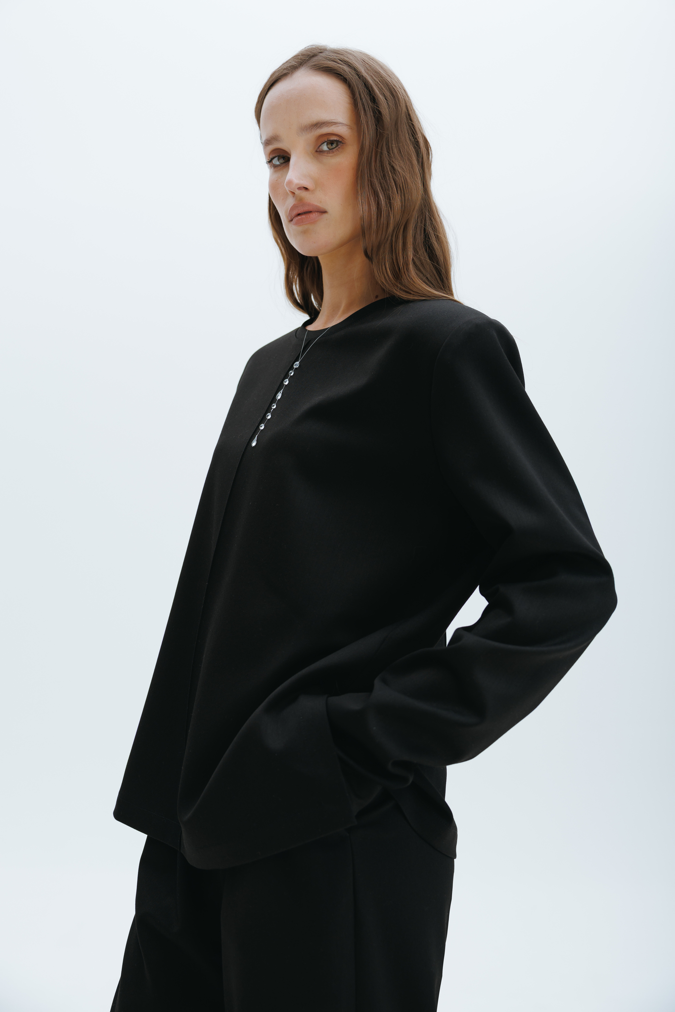 This streamlined top is crafted from structured suiting fabric, offering a refined balance of form and function. A clean central seam enhances the vertical line of the silhouette, lending subtle graphic definition. Long sleeves and precise construction create a composed, architectural shape.