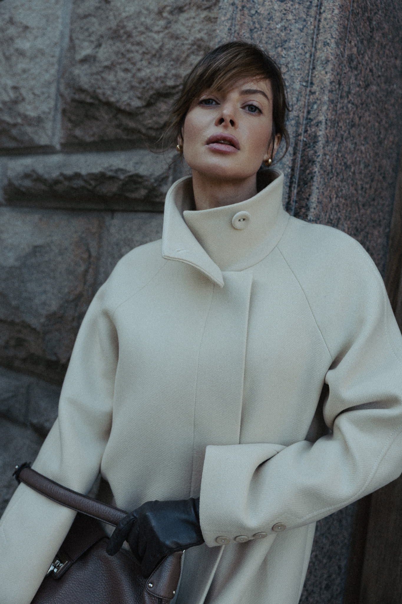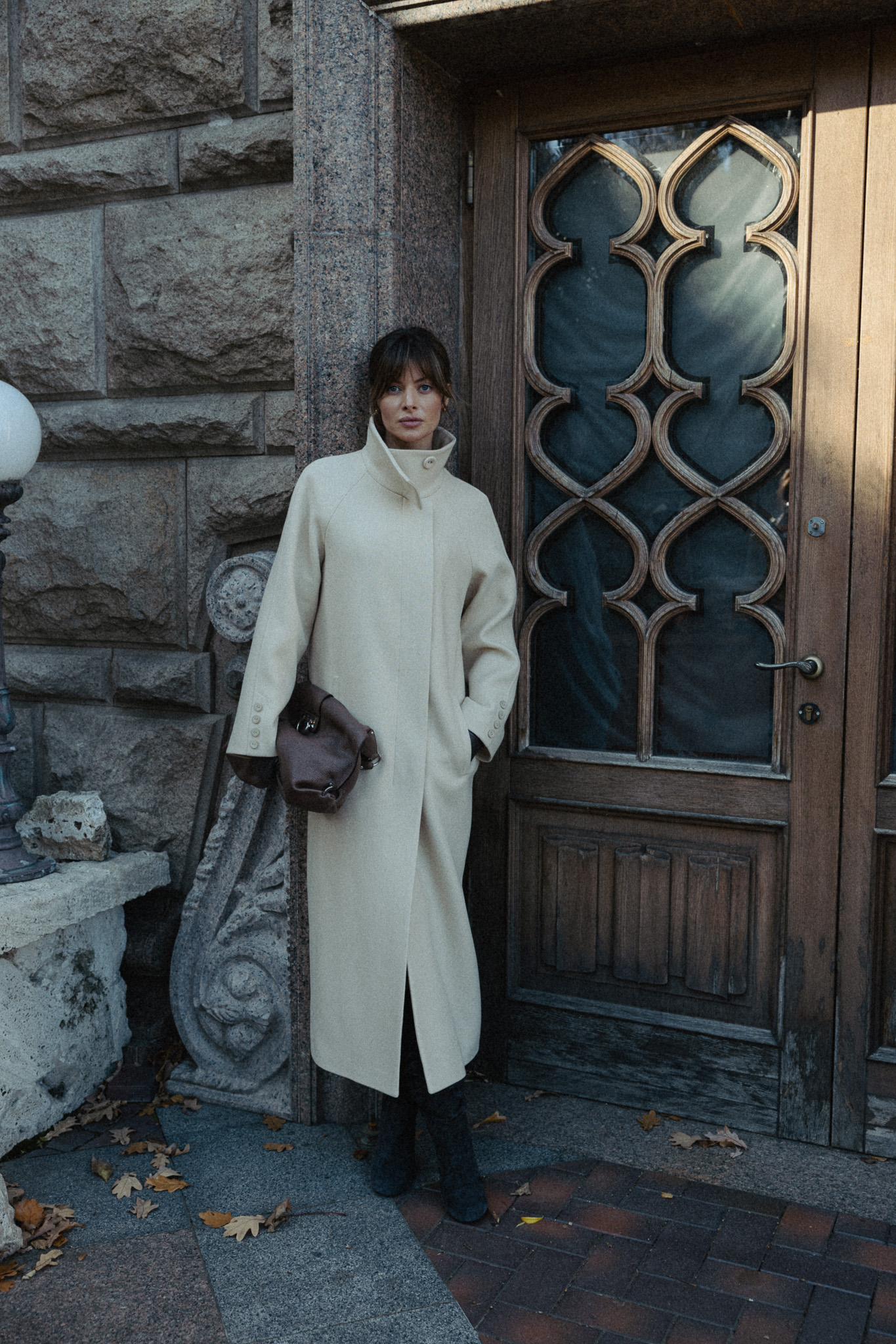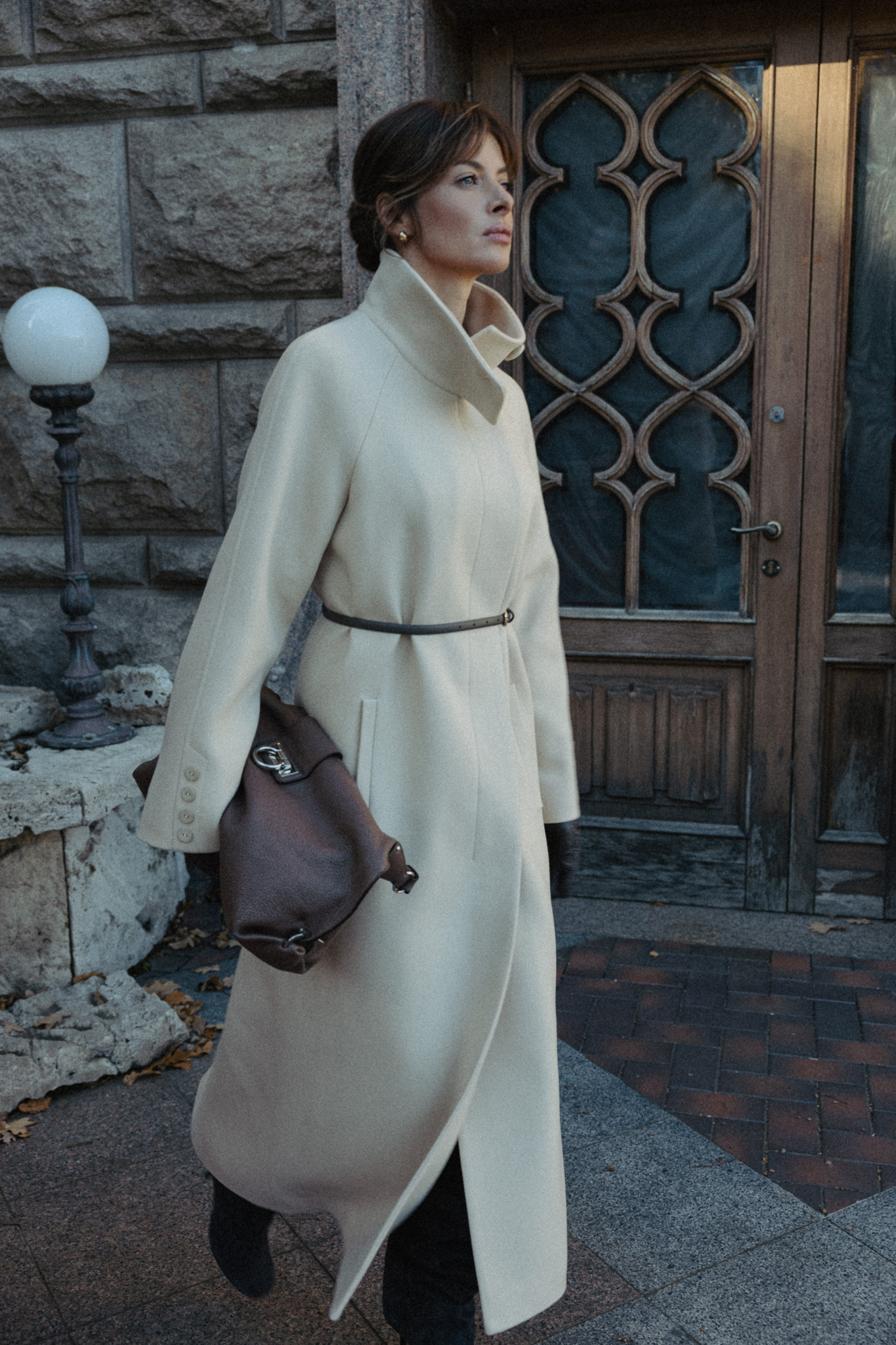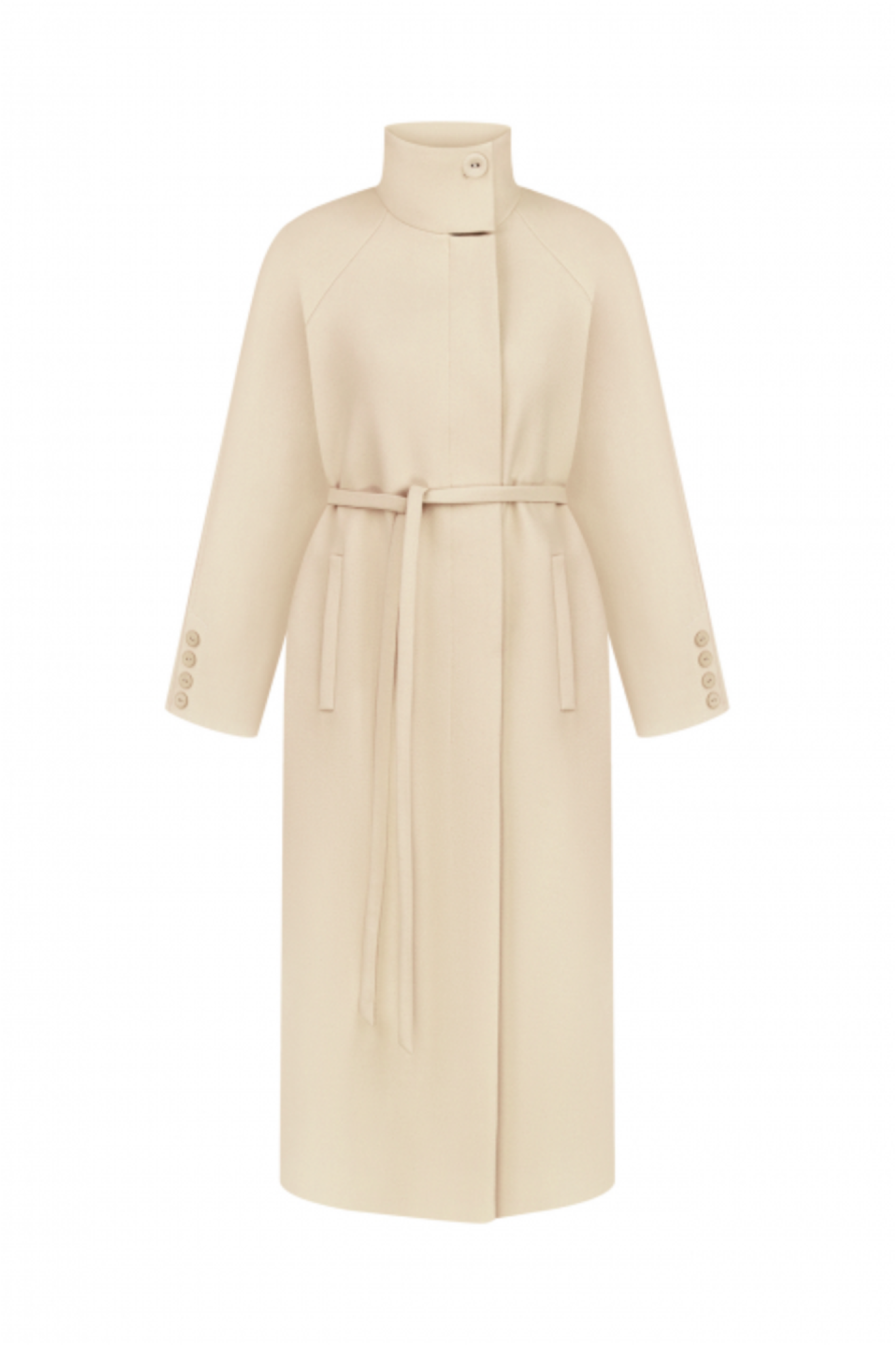 A simple, straight-cut coat with a high collar. The buttons are hidden by a placket for a clean silhouette. A thin belt is included, which subtly emphasizes the waist.