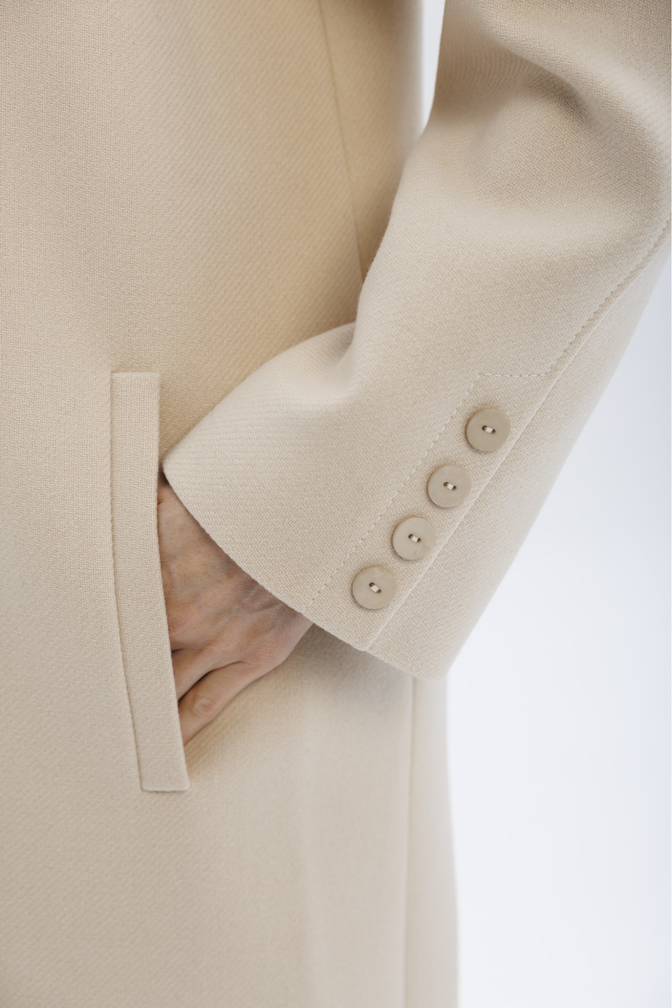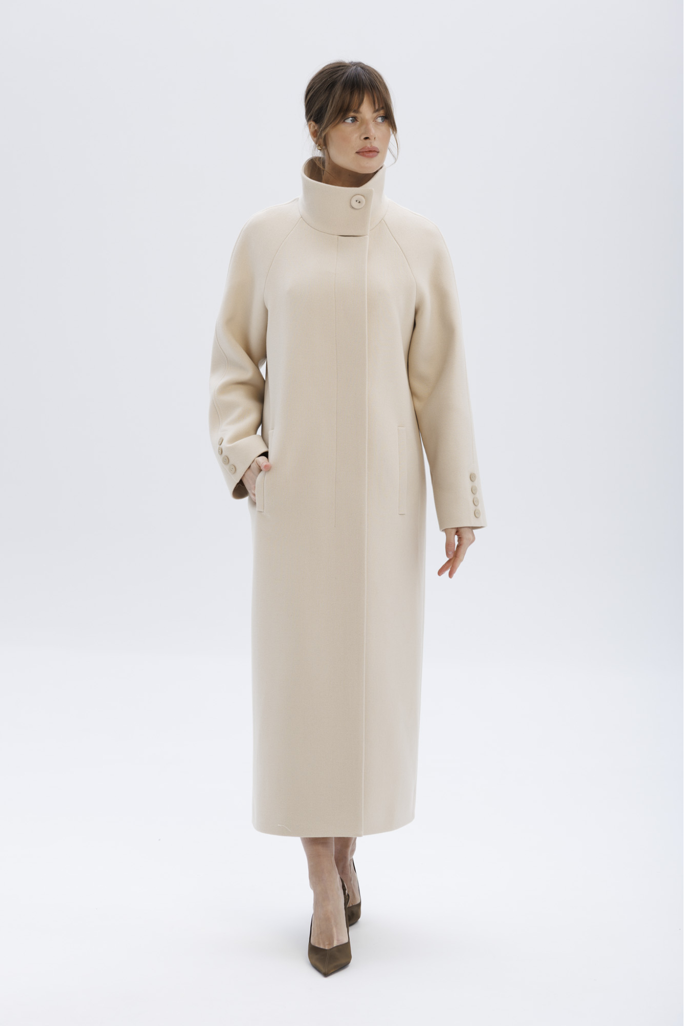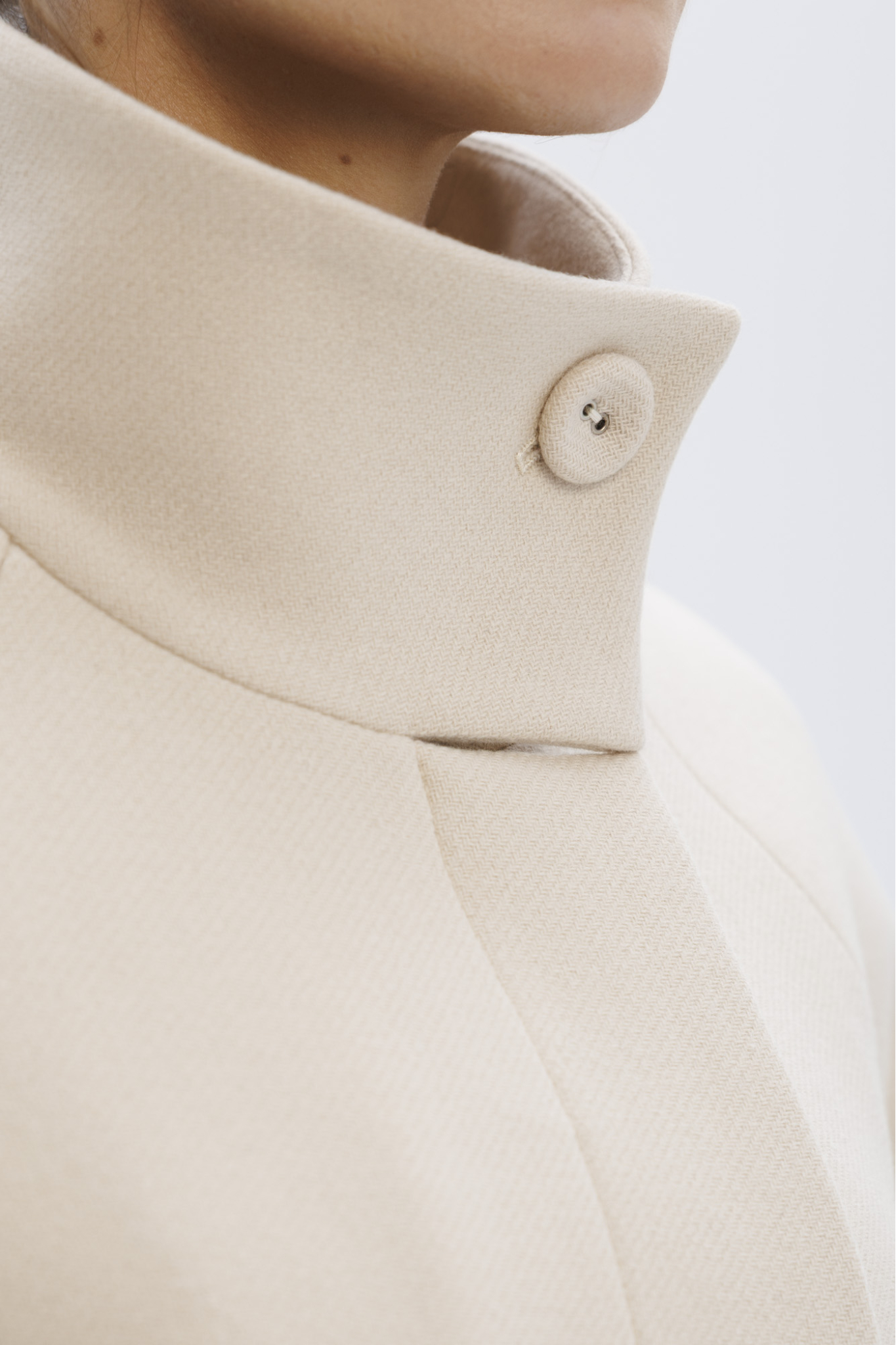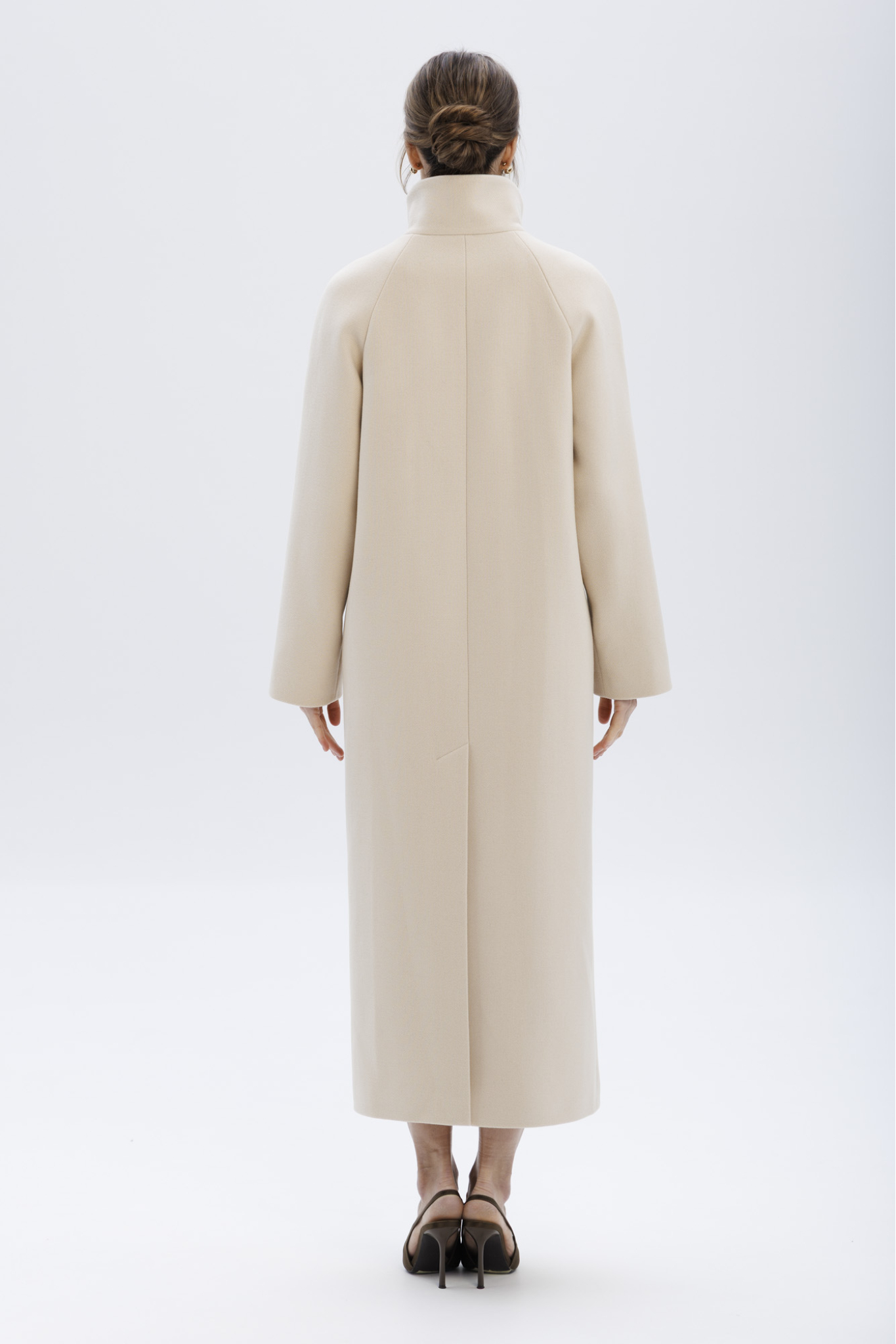 A simple, straight-cut coat with a high collar. The buttons are hidden by a placket for a clean silhouette. A thin belt is included, which subtly emphasizes the waist.