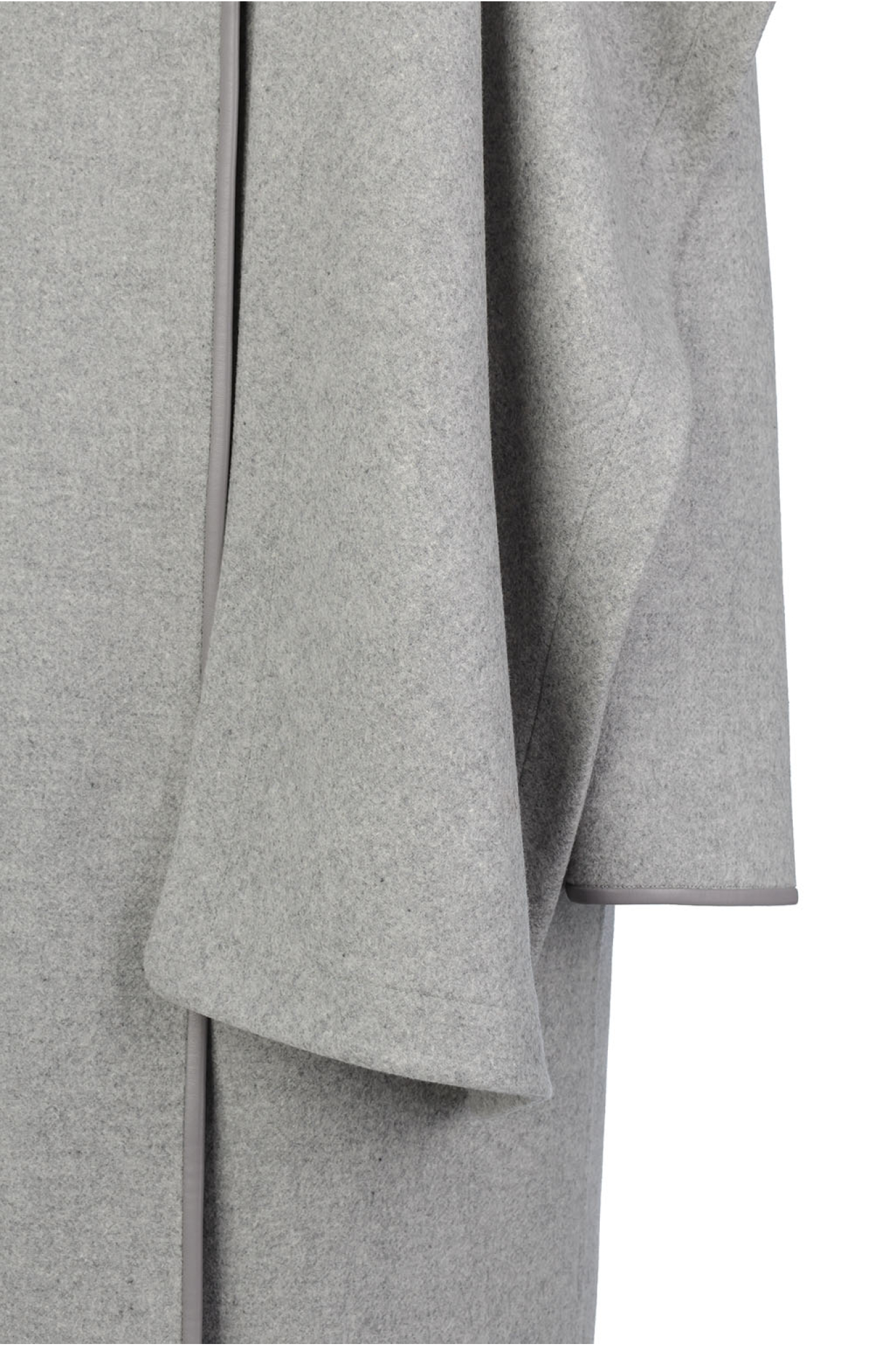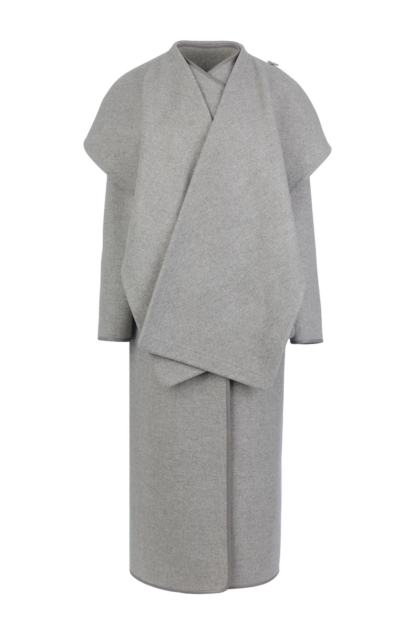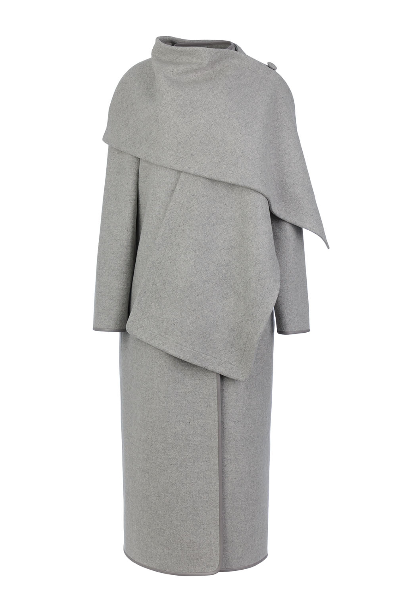 A straight-cut coat crafted from dense Italian wool, unlined for a clean, modern finish. The seams are trimmed with eco-leather detailing, perfectly matched to the main fabric. Features discreet concealed pockets. Includes a matching stole made from the same fabric, which can be worn separately or secured with a button.