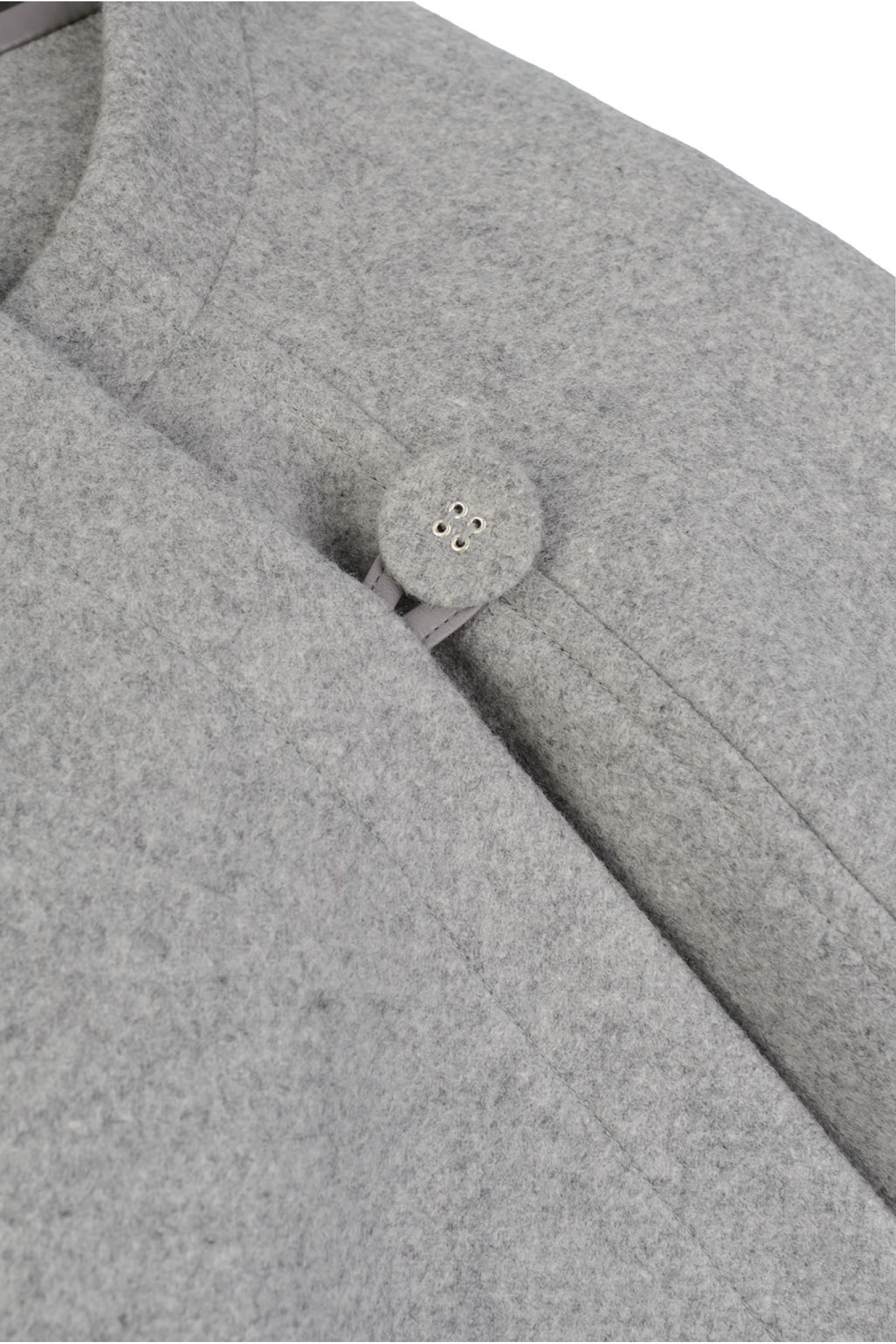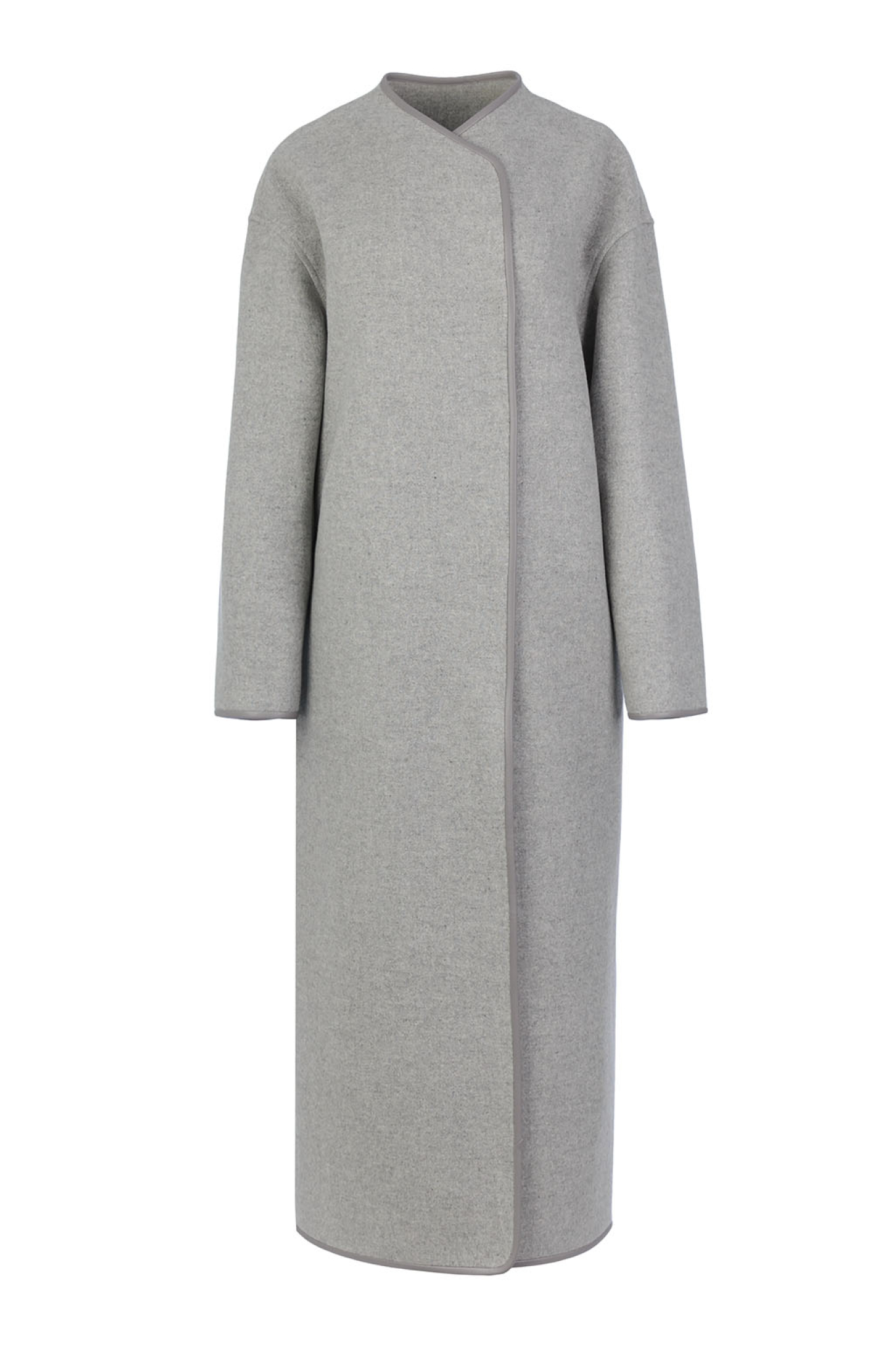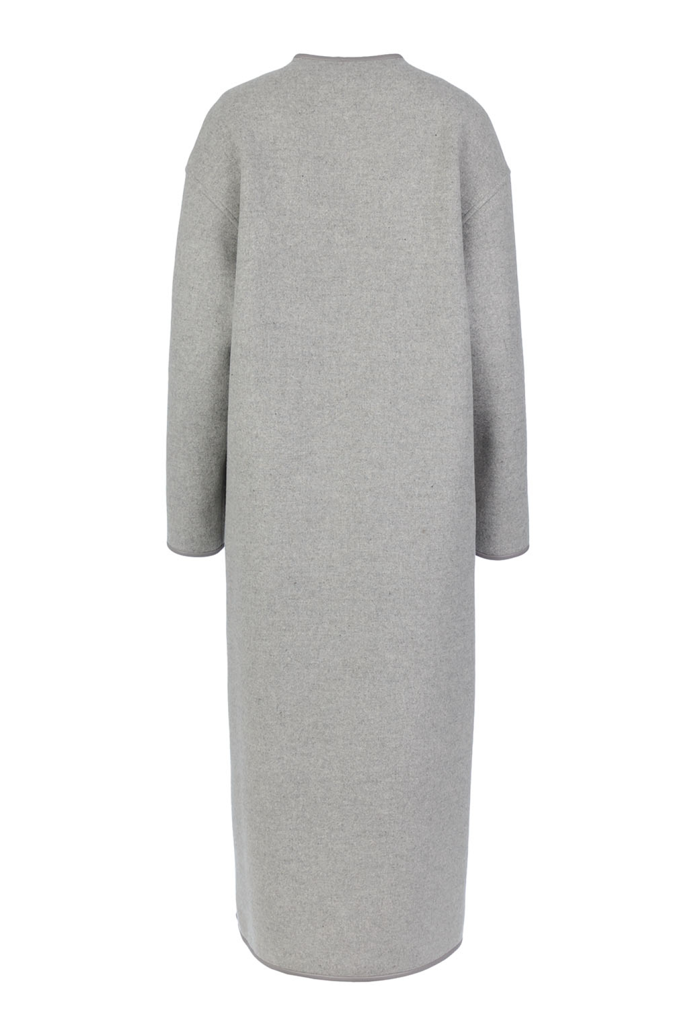 A straight-cut coat crafted from dense Italian wool, unlined for a clean, modern finish. The seams are trimmed with eco-leather detailing, perfectly matched to the main fabric. Features discreet concealed pockets. Includes a matching stole made from the same fabric, which can be worn separately or secured with a button.
