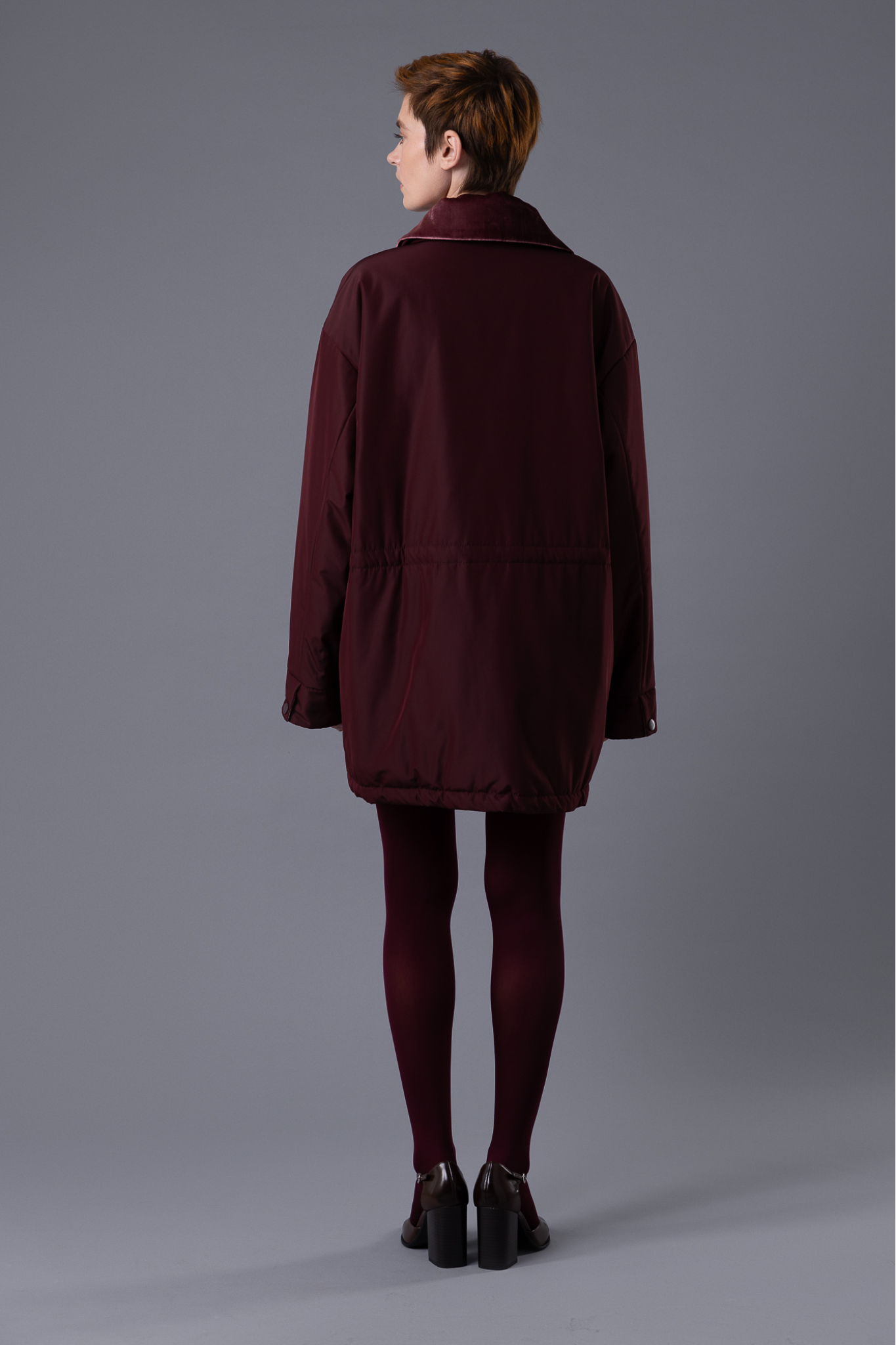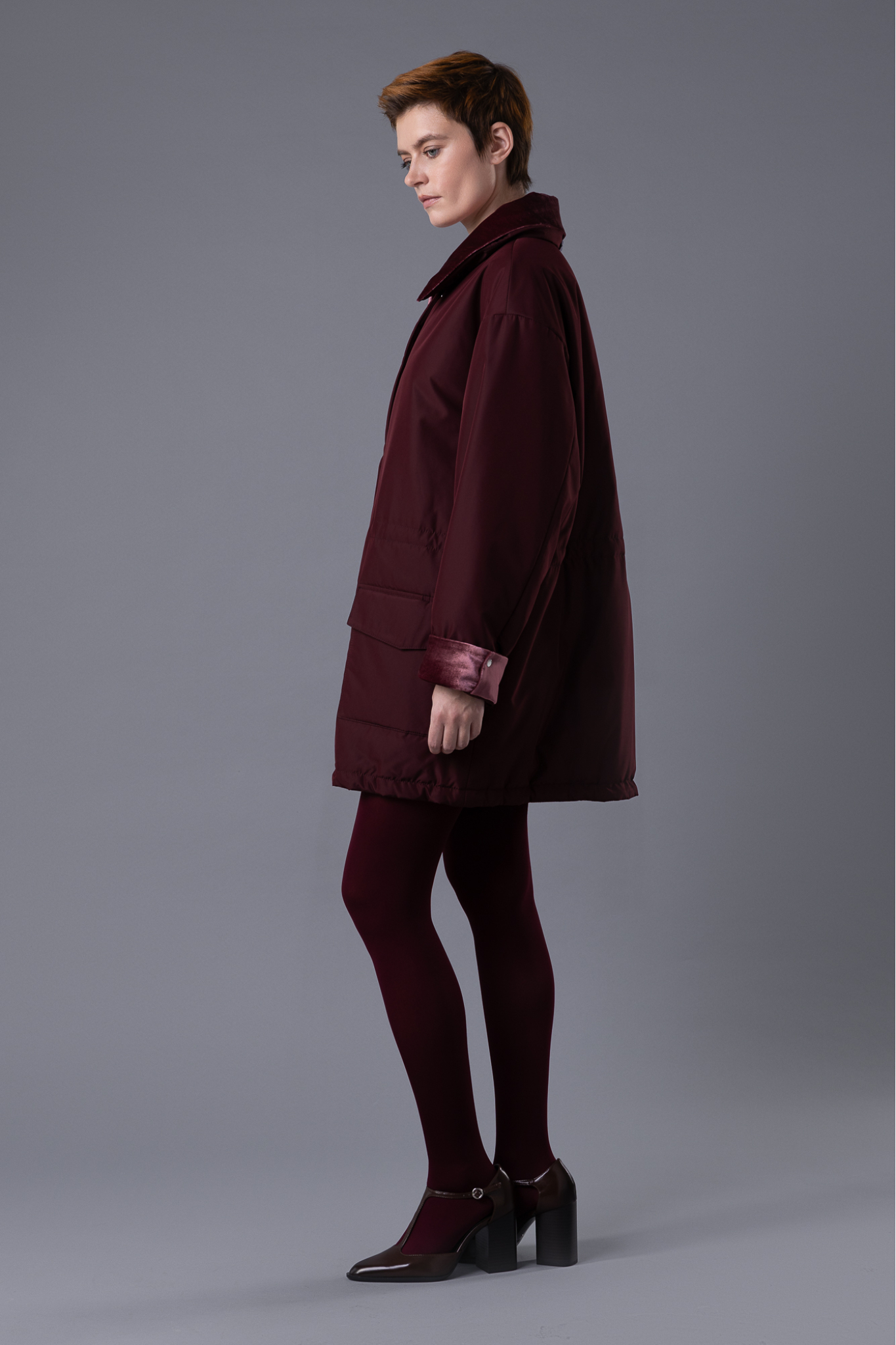 A straight-cut jacket with pockets. The collar is adorned with removable velvet, and the inner side of the sleeve cuffs is also lined with velvet. This detail provides added warmth where the jacket touches the skin, and the cuffs can be rolled up for a stylish look.