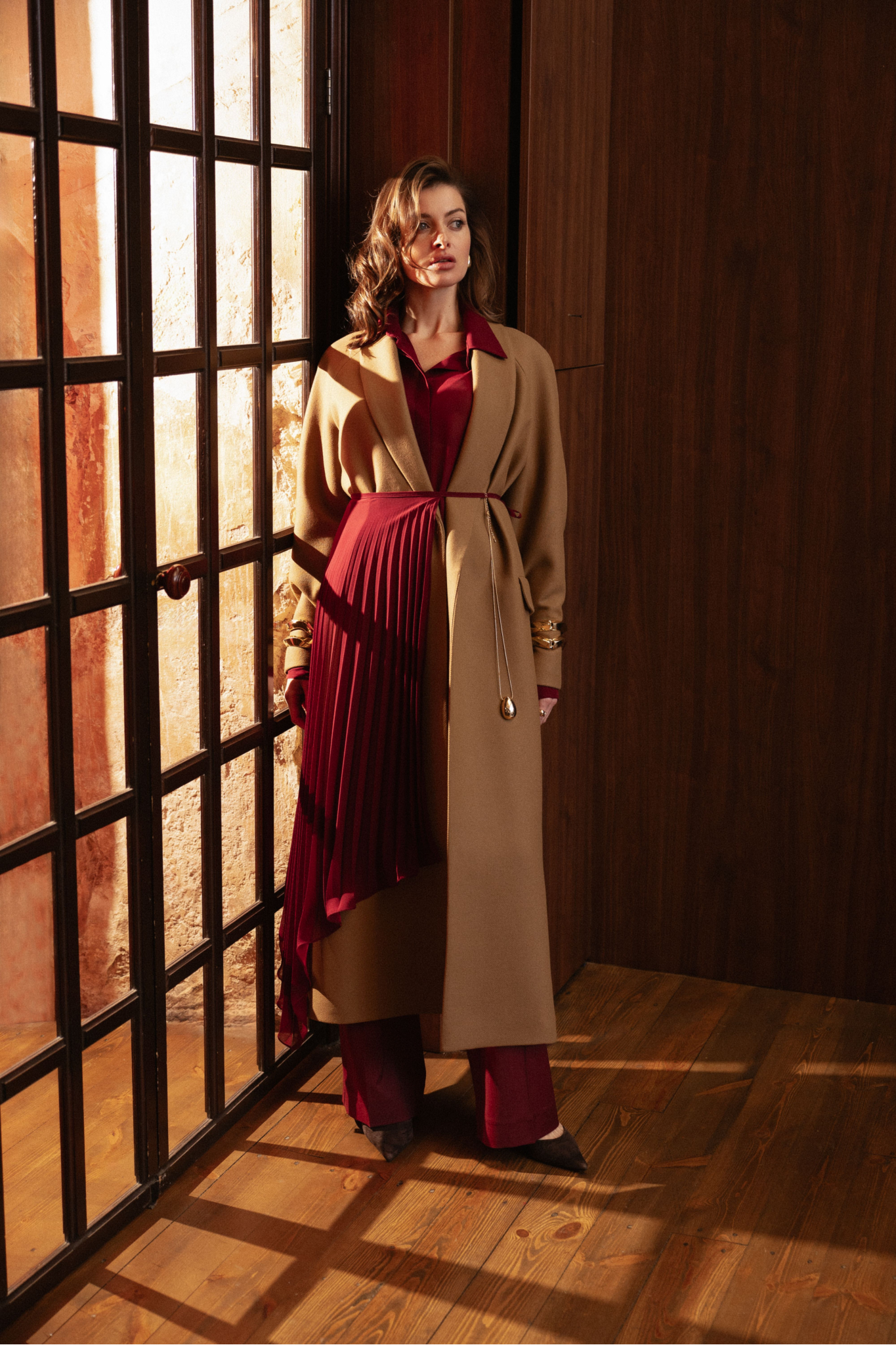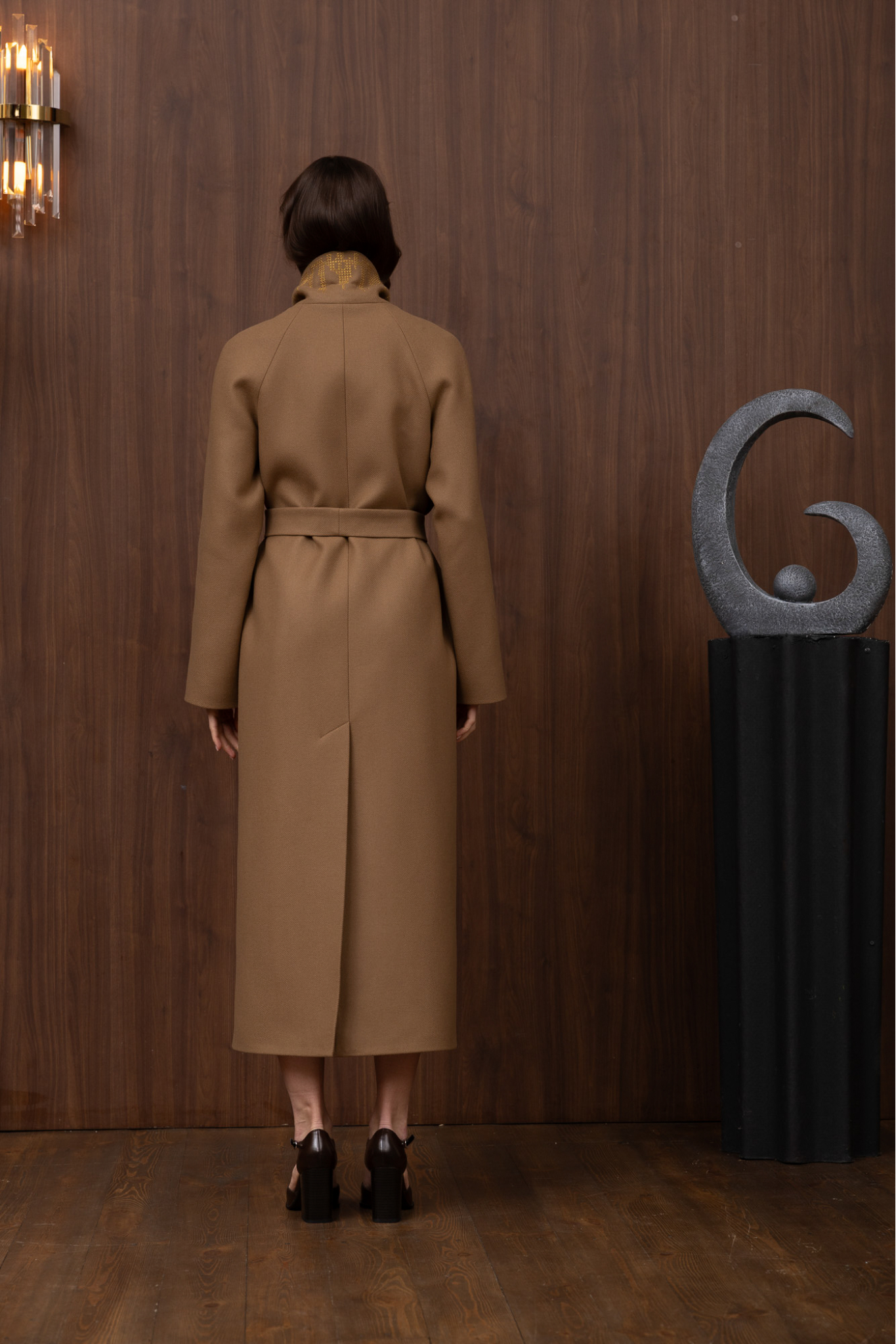 Belted wrap coat with shawl collar and raglan sleeves. Laconic minimalist model with smooth lines.