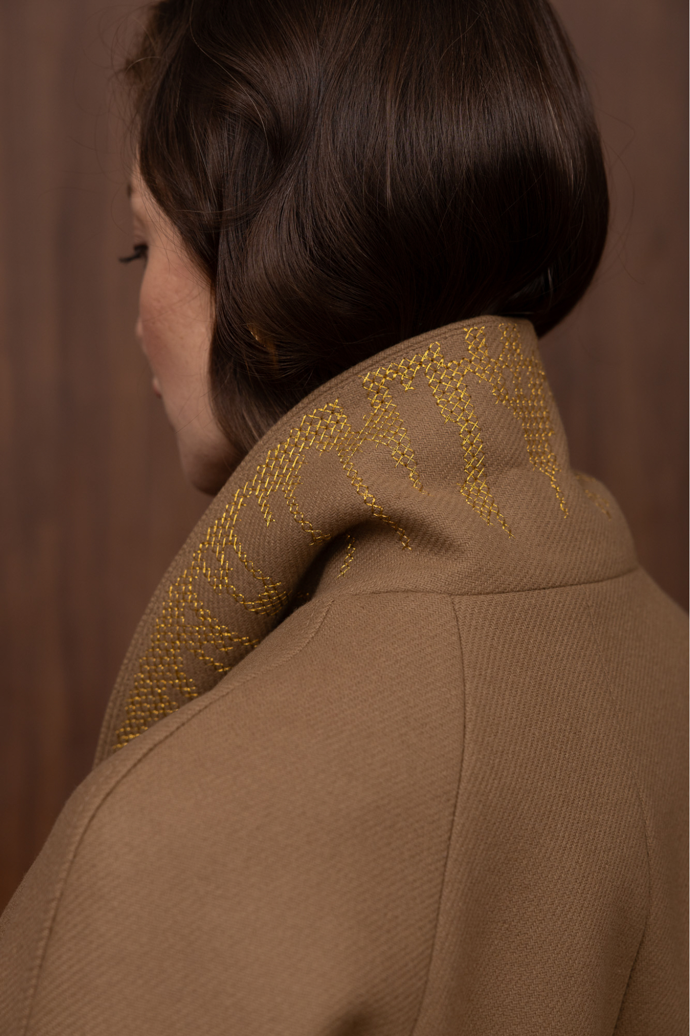A separate decoration of the coat is the embroidered bottom part of the collar.