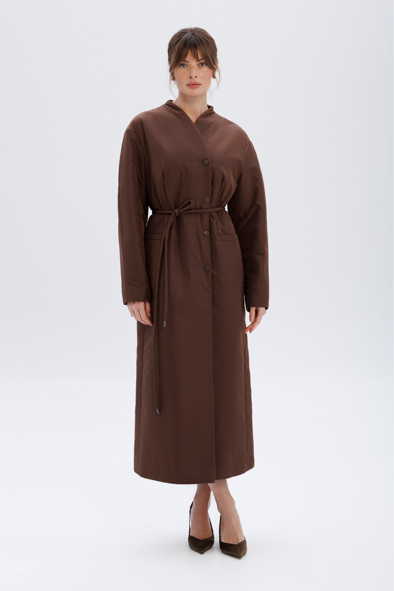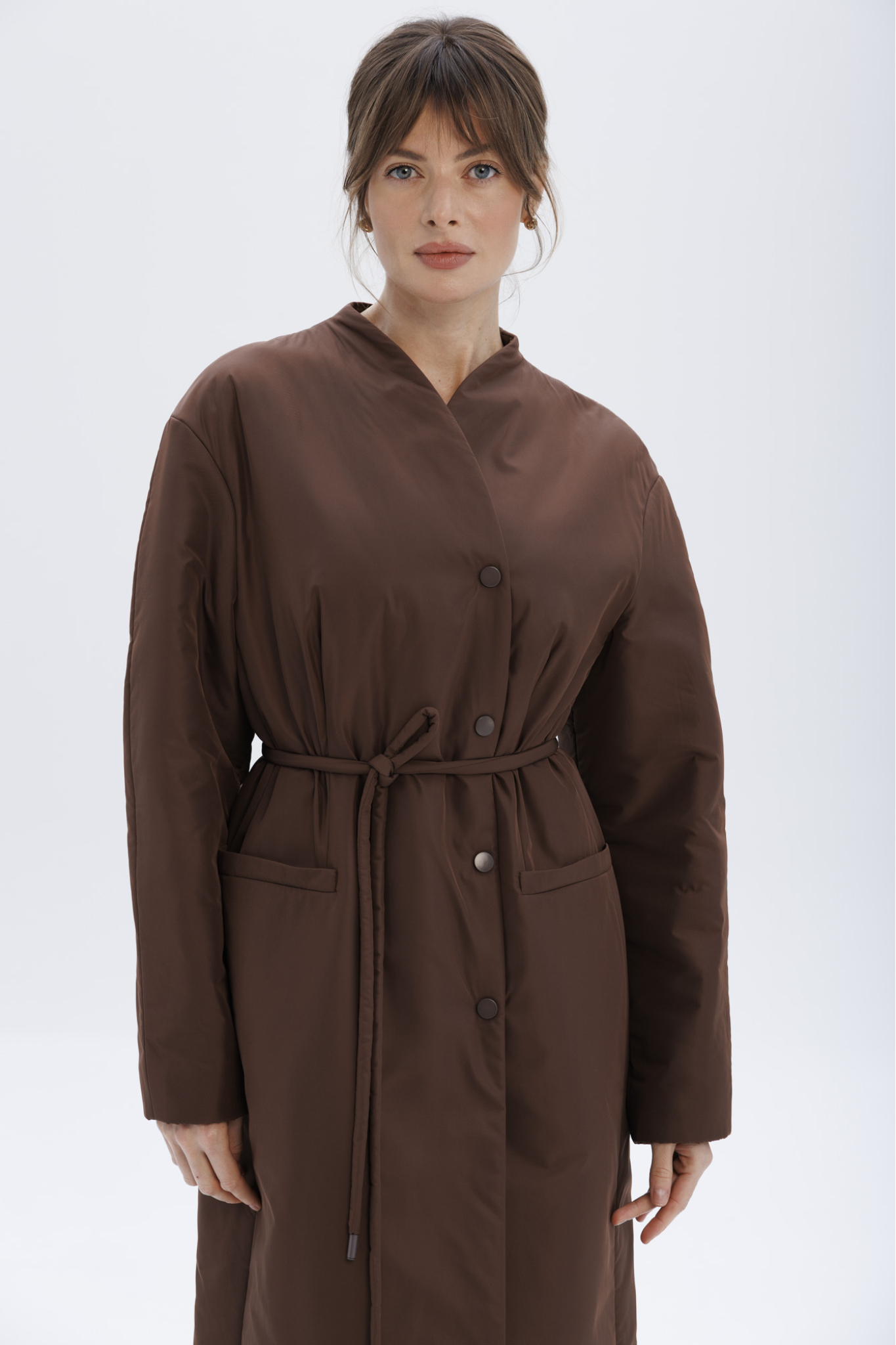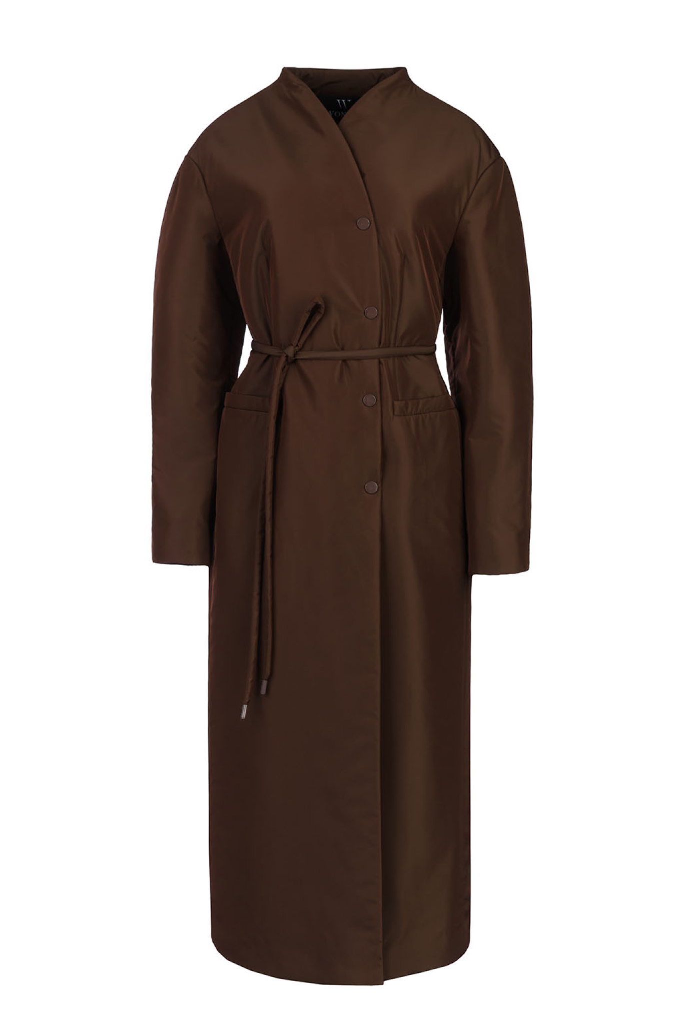 Приталенное пальто-пуховик из плащевой ткани. Модель имеет структурированный крой с четко выраженной линией талии и объемными рукавами. Кнопки окрашены в тон ткани, в комплекте пояс-жгут из основной ткани.