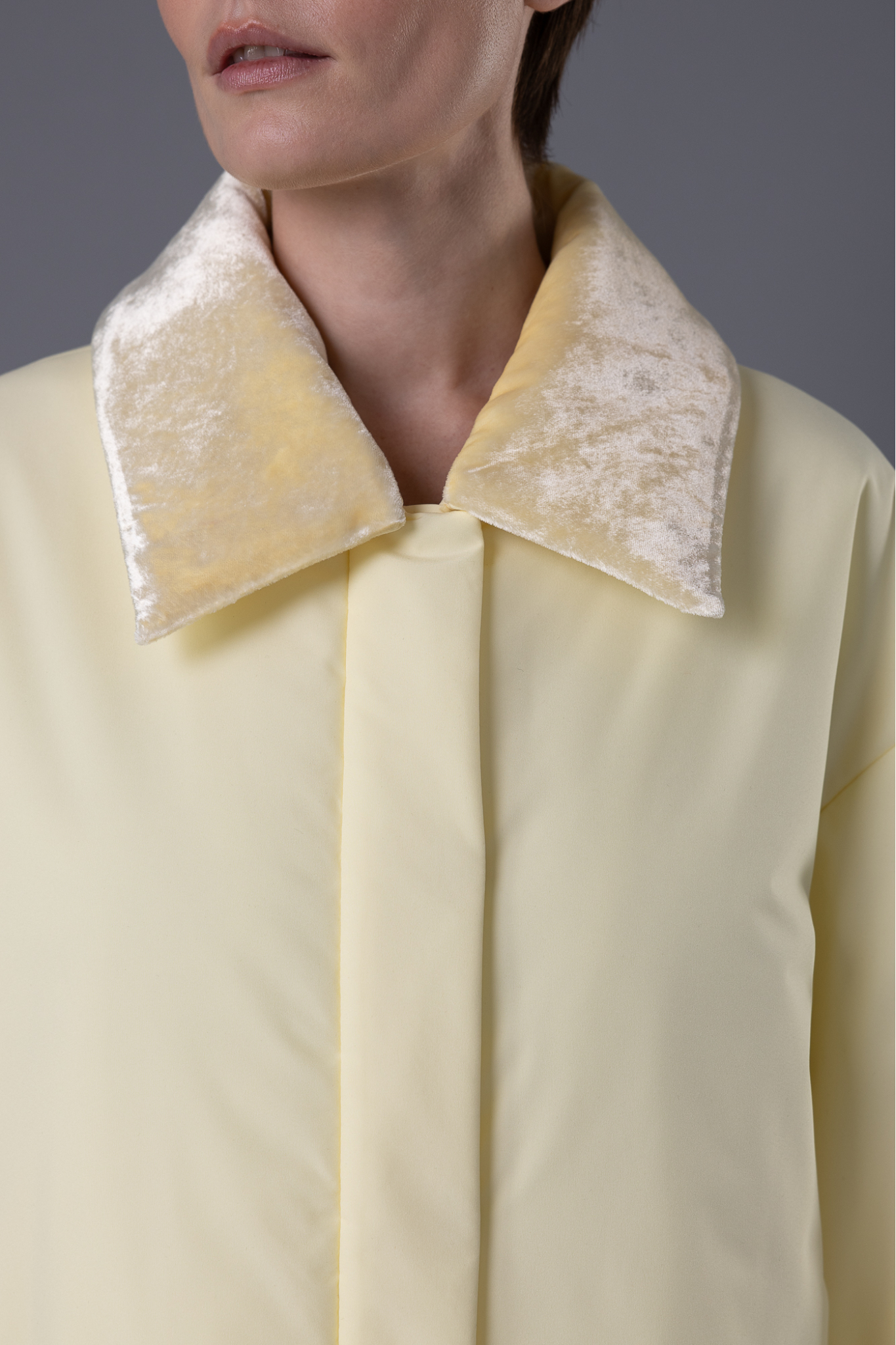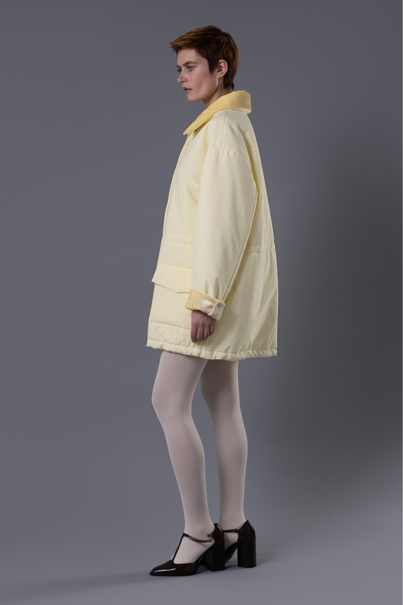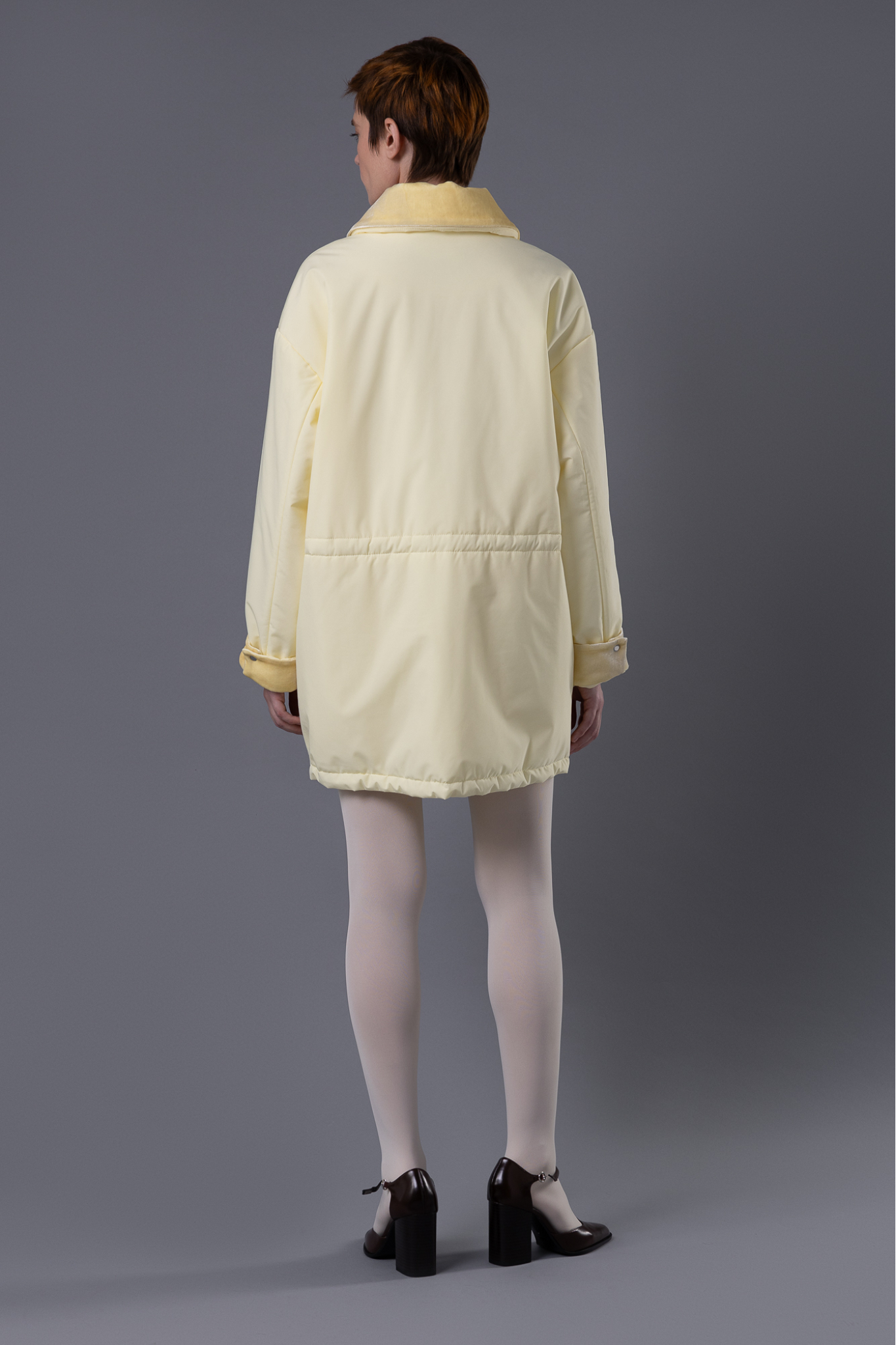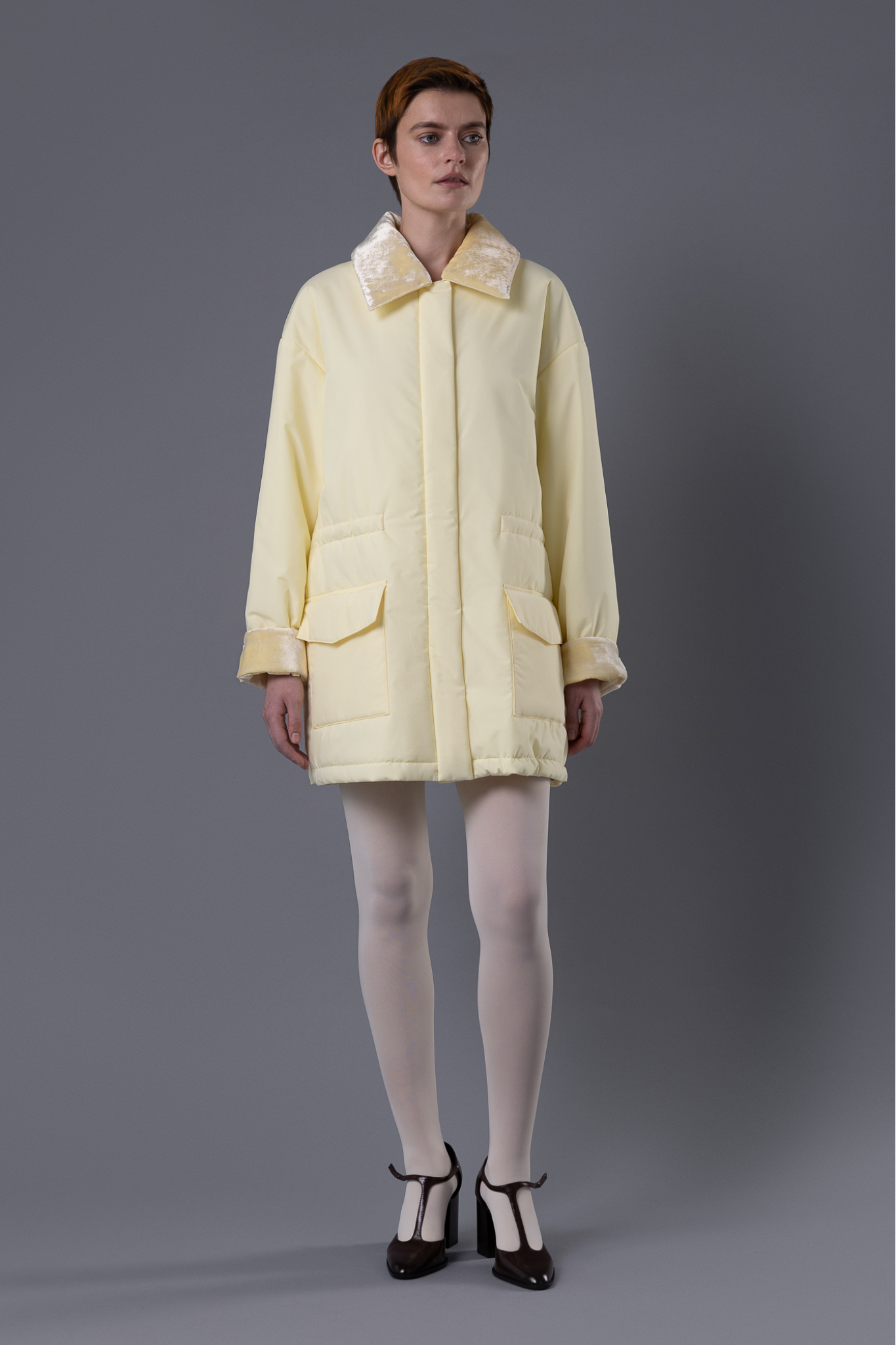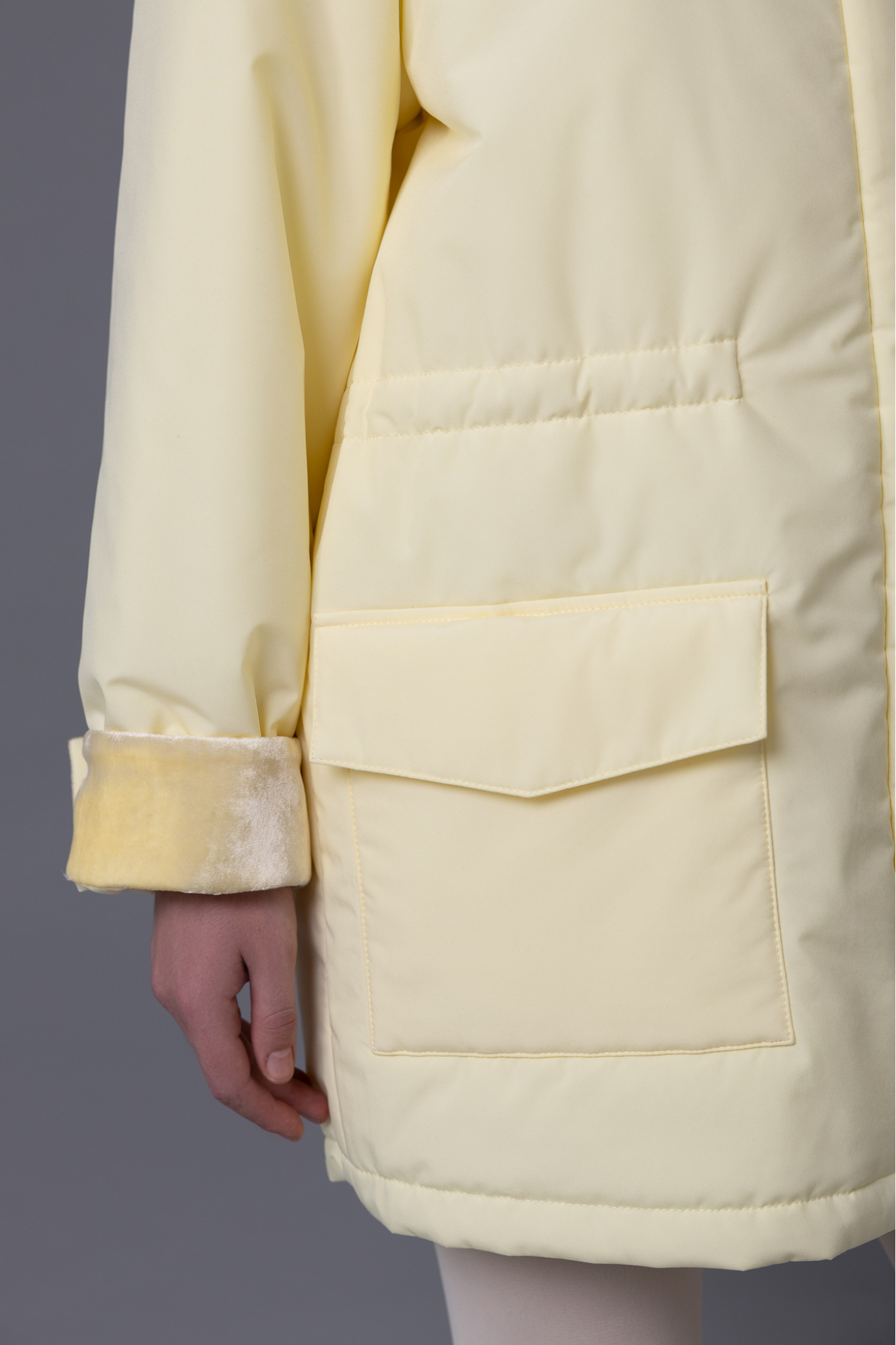 Куртка прямого кроя с карманами. Воротник куртки украшен бархатом, который можно снимать. Внутренняя сторона манжета рукава также украшена бархатом. С одной стороны это придаст дополнительное приятное тепло, когда куртка будет касаться кожи, с другой – манжет можно подкатить.