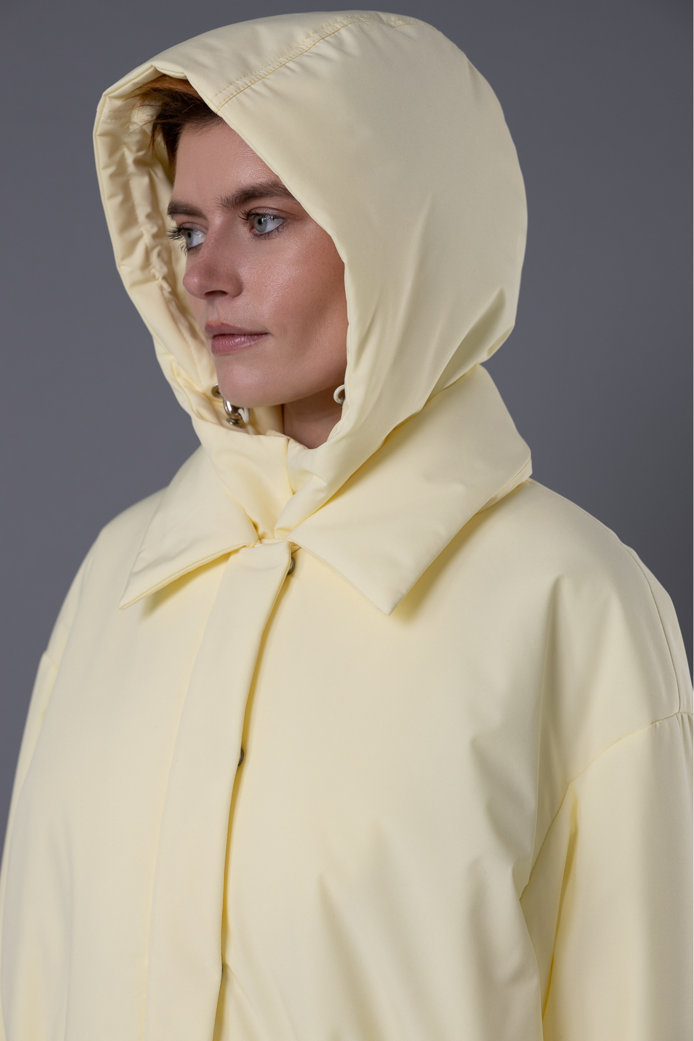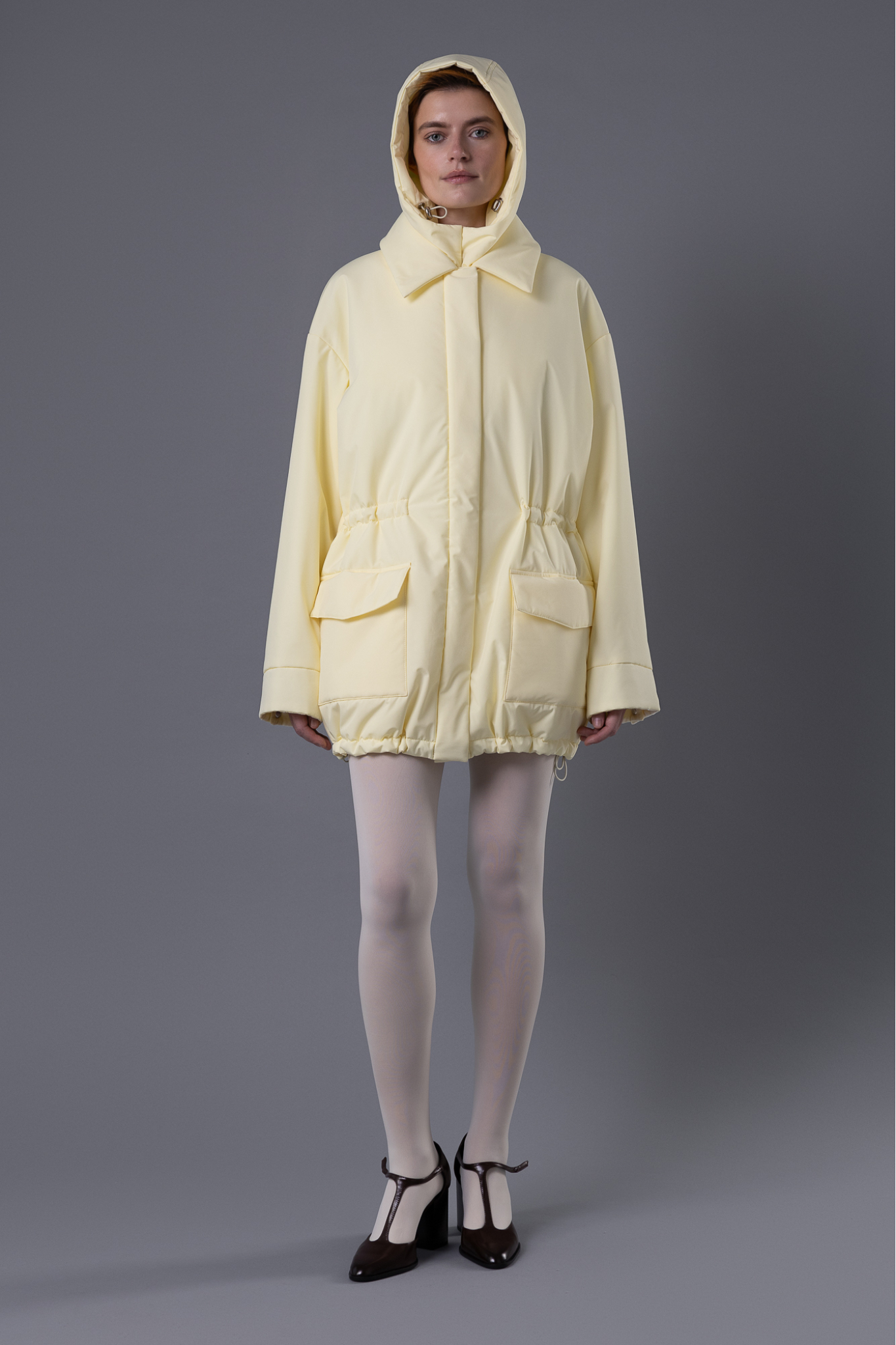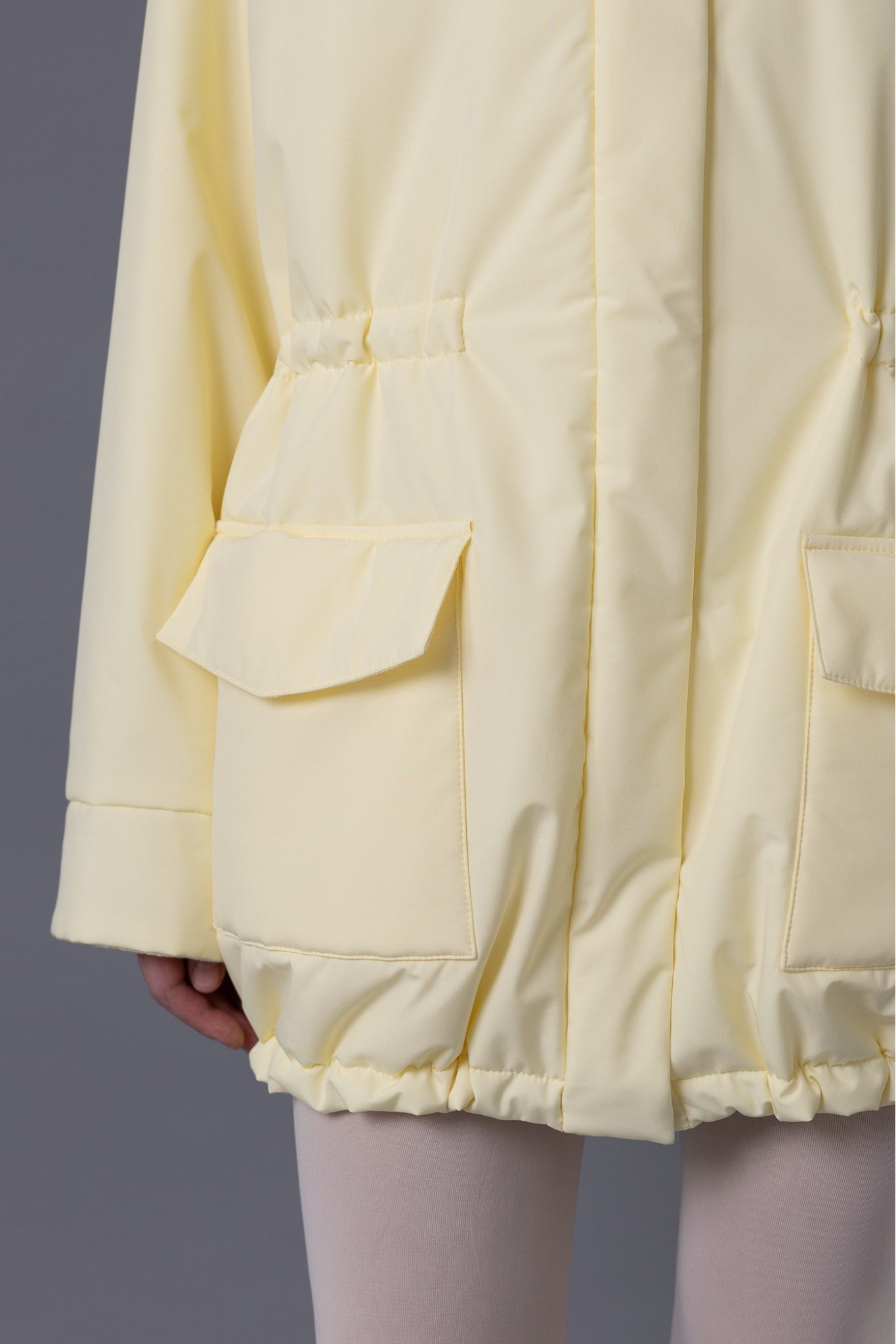 Куртка имеет на талии и внизу кулисы. Таким образом, есть возможность менять силуэт куртки, затянув кулисы.