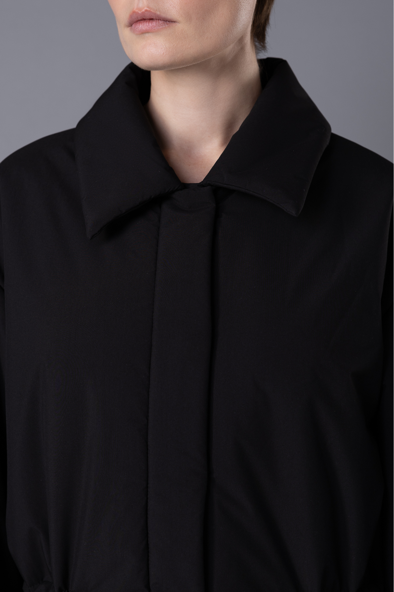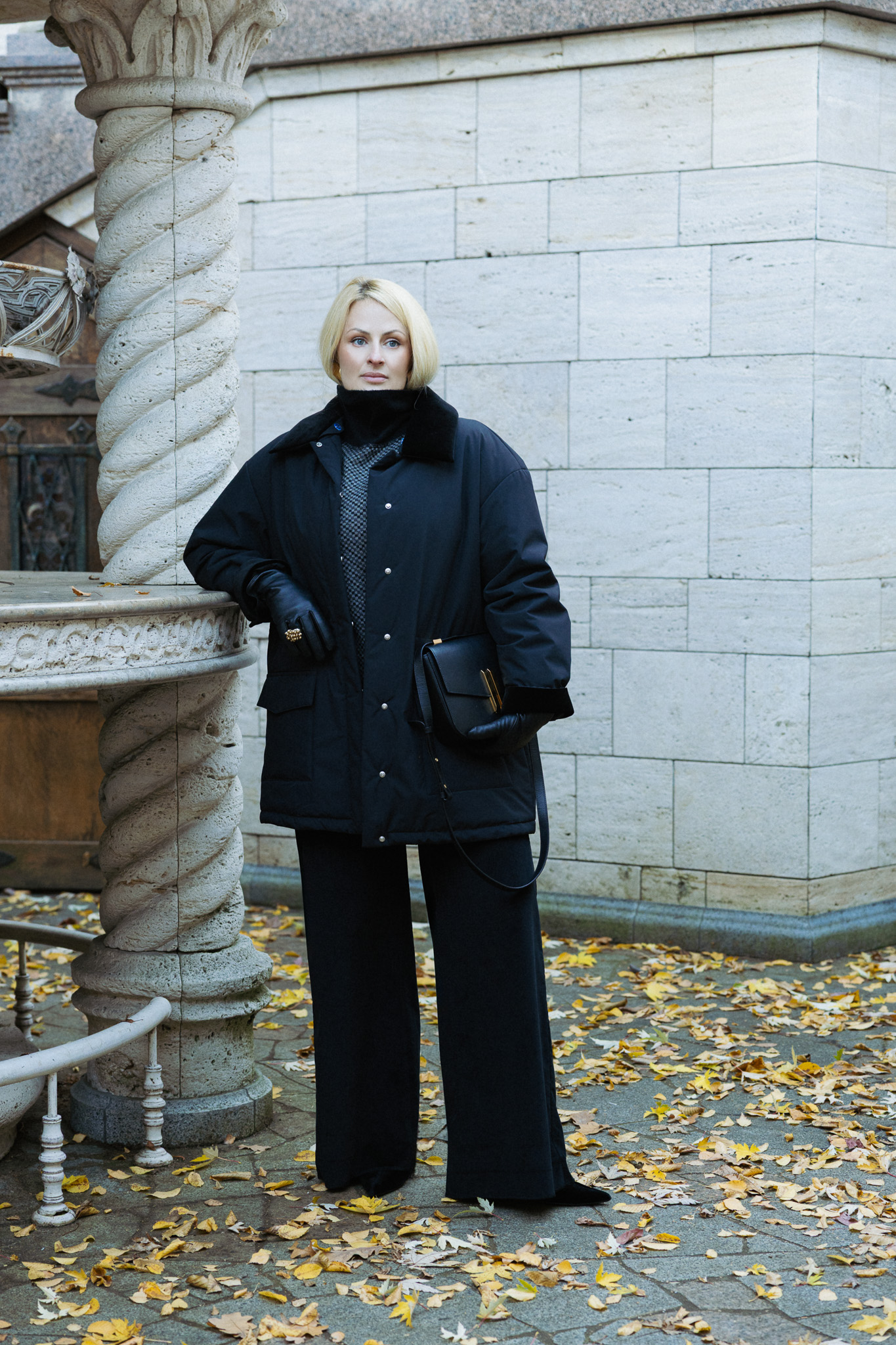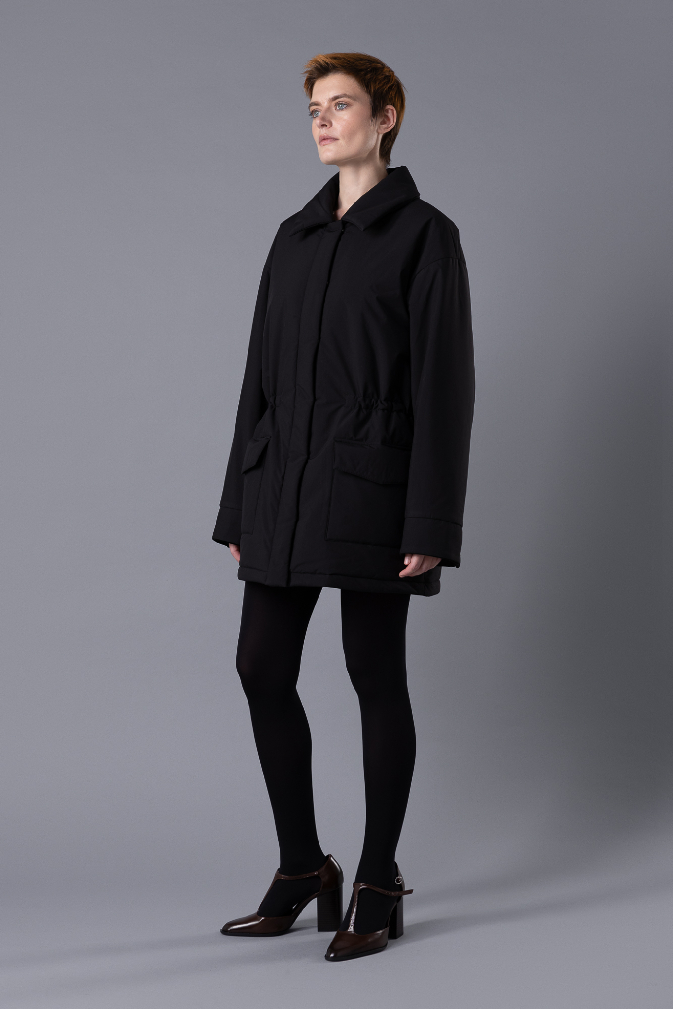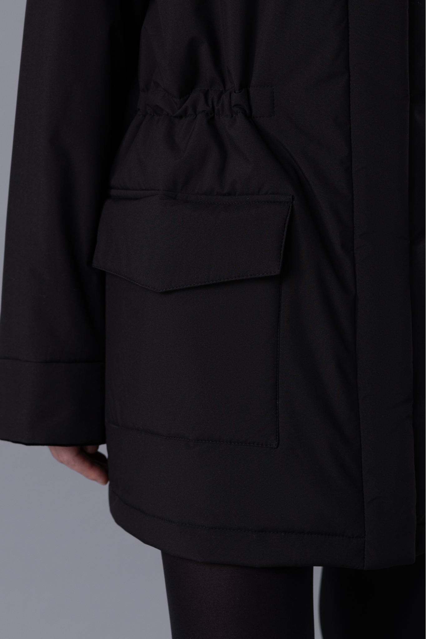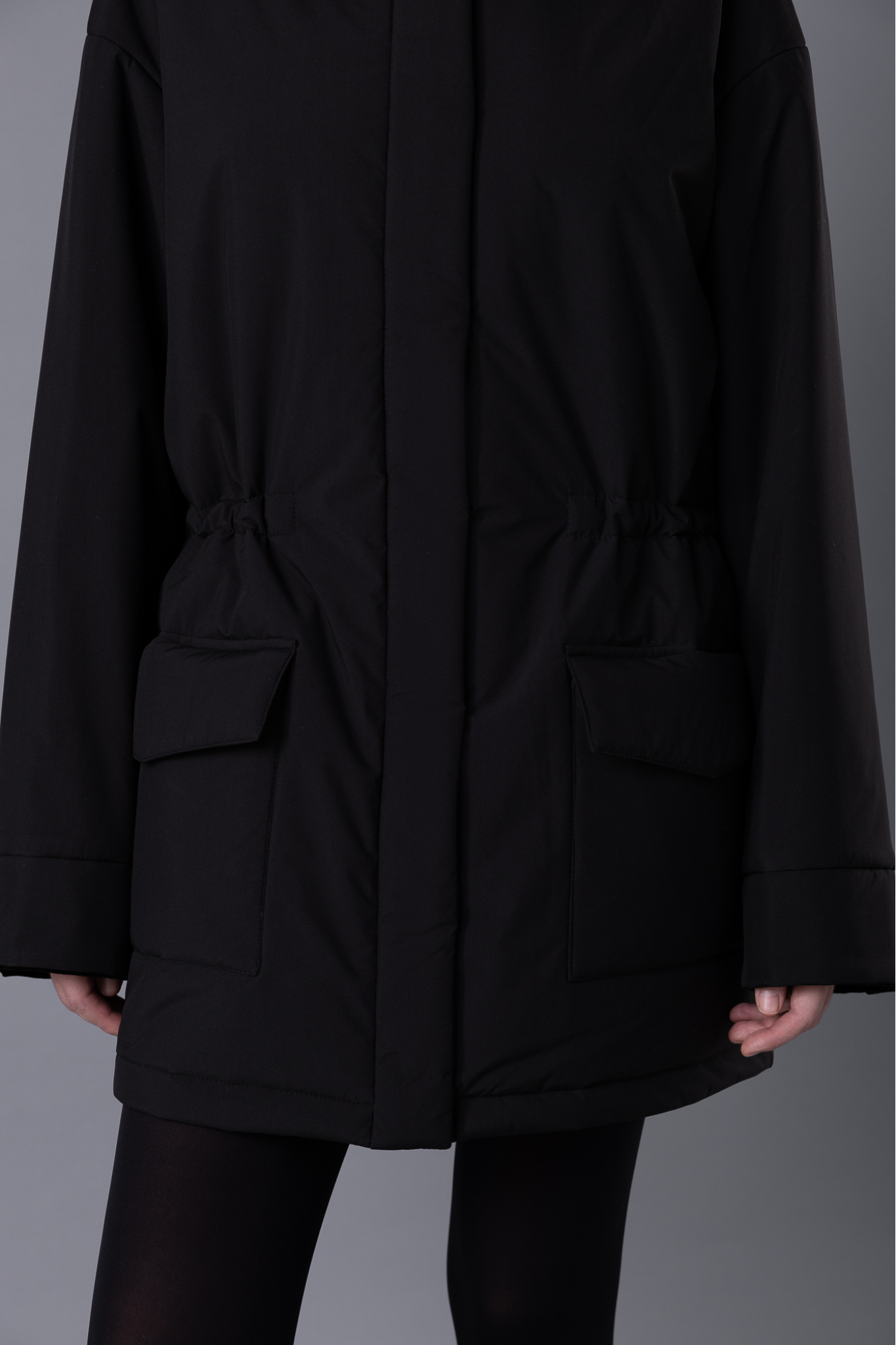 Куртка имеет на талии и внизу кулисы. Таким образом, есть возможность менять силуэт куртки, затянув кулисы.