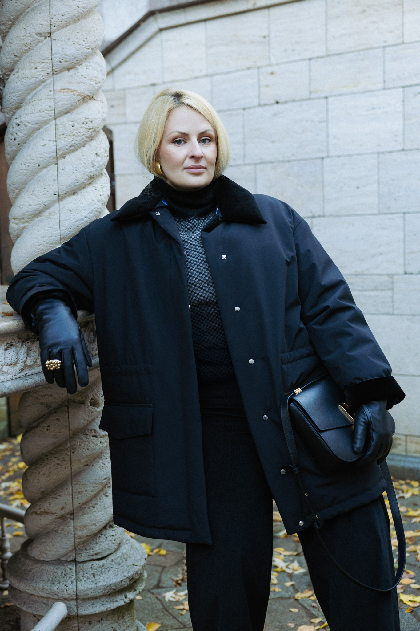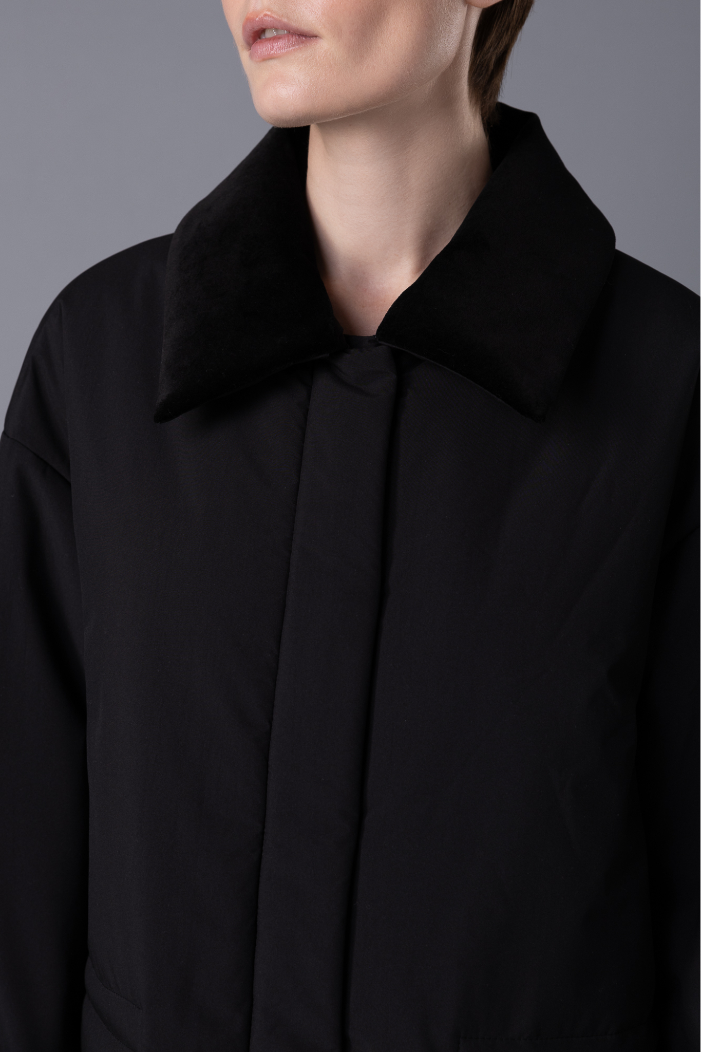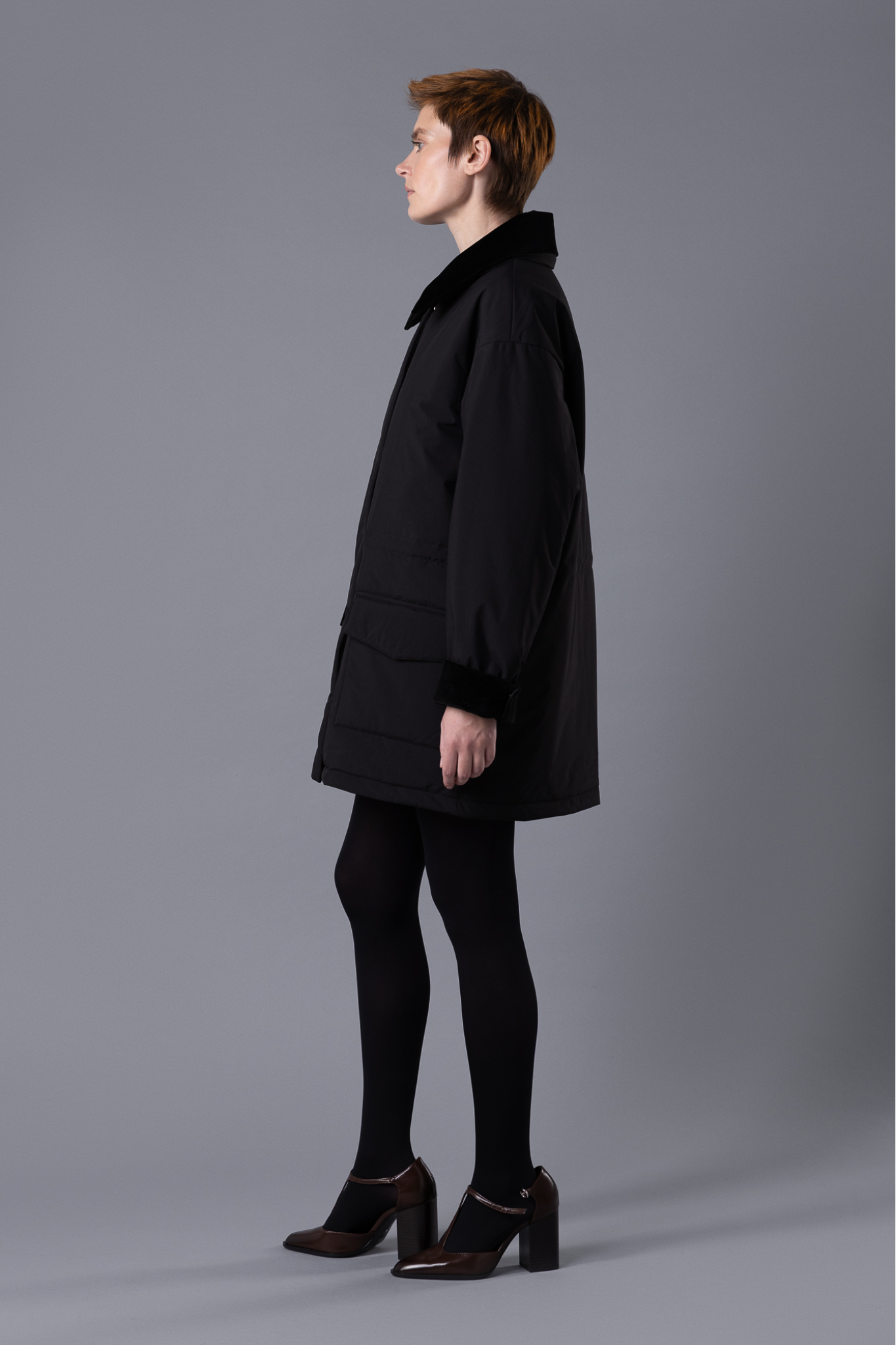 Куртка прямого кроя с карманами. Воротник куртки украшен бархатом, который можно снимать. Внутренняя сторона манжета рукава также украшена бархатом. С одной стороны это придаст дополнительное приятное тепло, когда куртка будет касаться кожи, с другой – манжет можно подкатить.